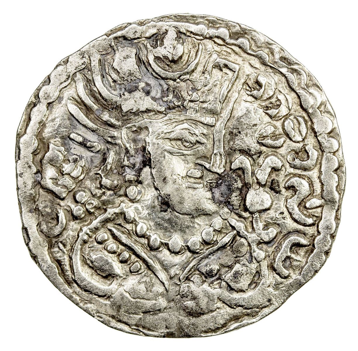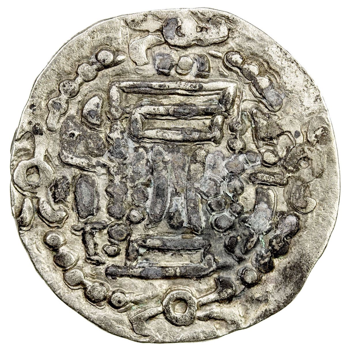 TOBAZINI: Anonymous, ca. 420-475, AR drachm (3.00g), Vondrovec-32, imitating a drachm of the Sasanian Varhran IV (388-399), Bactrian legend and tamgha to right on the obverse, with the same tamgha four times attached to the reverse border; struck in the region north of the Hindu Kush, some discoloration on the reverse; bold strike, choice VF.