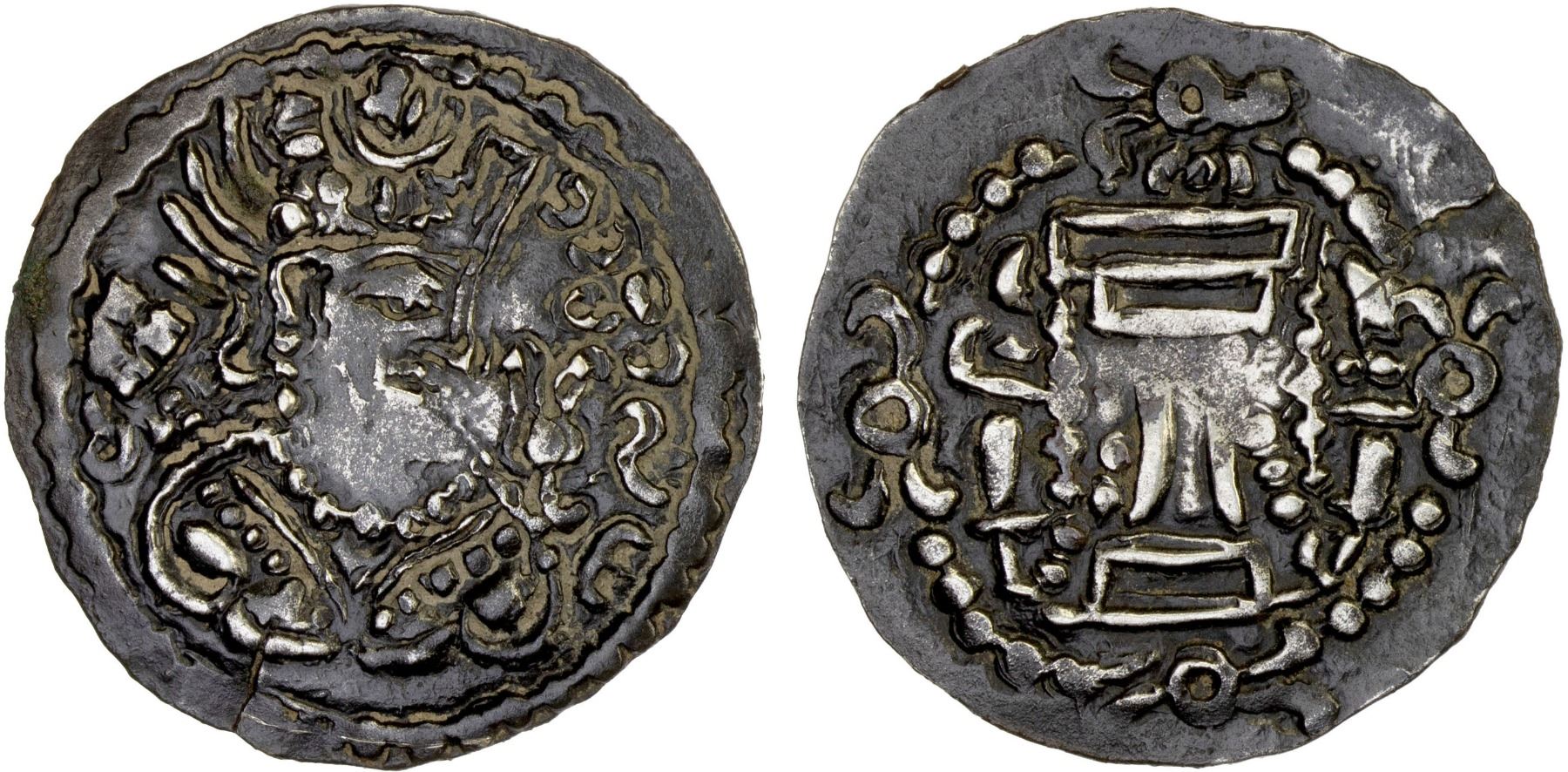 TOBAZINI: Anonymous, ca. 420-475, AR drachm (3.76g), Vondrovec-32A, imitating a drachm of the Sasanian Varhran IV (388-399), Bactrian legend and tamgha to right on the obverse, with the same tamgha four times attached to the reverse border; struck in the region north of the Hindu Kush, bold strike, VF-XF, RR. The 4 tamghas are each standard tamgha of Samarkand, but it is not known why the local rulers would have used that tamgha.