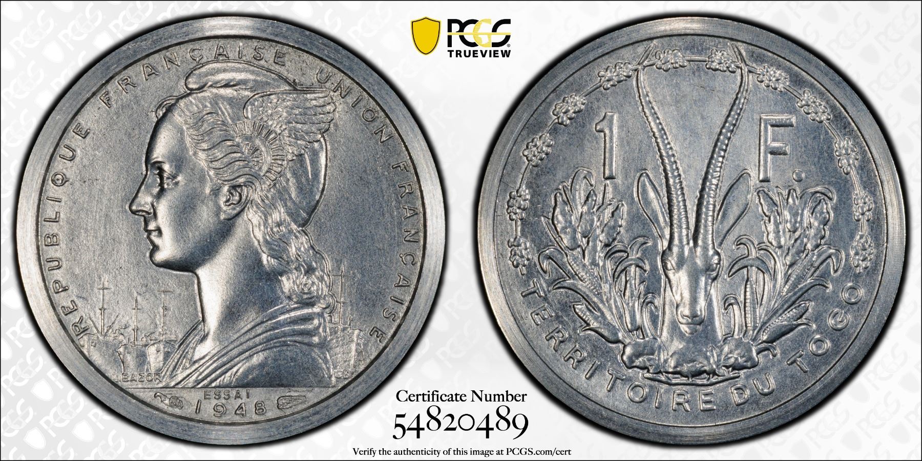 TOGO: French Colony, 1 franc, 1948, KM-PE1, Lec-17, ESSAI piedfort (piéfort) strike, very lustrous, mintage of only 104 pieces, rare, PCGS graded Specimen 63.