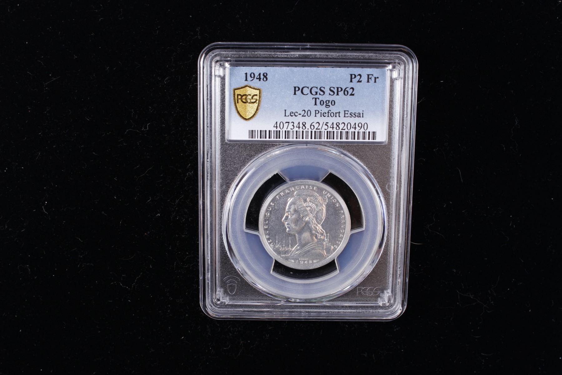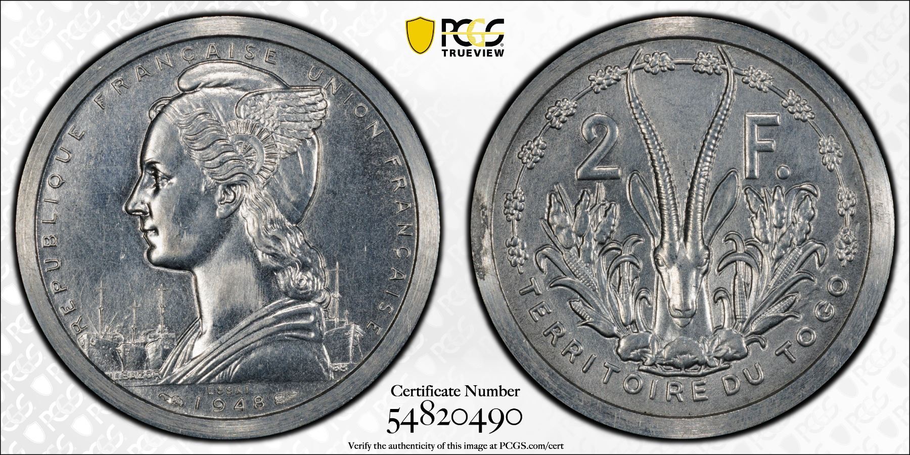 TOGO: French Colony, 2 francs, 1948, KM-PE2, Lec-20, ESSAI piedfort (piéfort) strike, very lustrous, mintage of only 104 pieces, rare, PCGS graded Specimen 62.