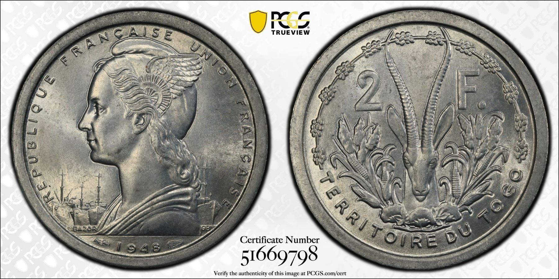 TOGO: French Union, 2 francs, 1948, KM-5, Lec-22, a wonderful lustrous example! PCGS graded MS64, ex Almer H. Orr III Collection.