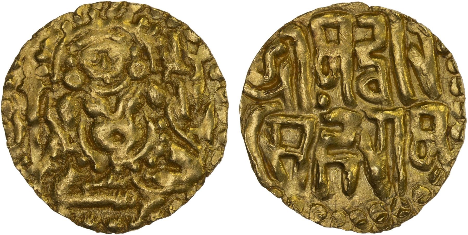 TOMARAS OF GWALIOR: Virasimha Rama, ca. 1350-1400, AV pagoda (3.59g), De-153, deity Kubera seated cross-legged, holding a danda in right hand and a lotus in left // Nagari legend sri madveera / simha rama, XF-AU, RRRR. Deyell knew of only 1 specimen of this type, and only 1 more have appeared on CoinArchives, sold in India in January 2026.