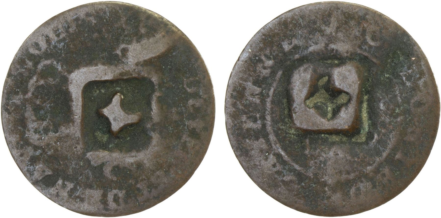 TORTOLA: AE black dogg (1½ pence), ND (1792-1811), KM-11, Prid-19 var, counterstamped Cayenne 2 sous with an incuse capital "H" within a diamond or square on worn host, so-called "Hodge Dogg", VG, ex Glendining & Co., 21-22 September 1981, Maj. Fred S. Pridmore, Part I, lots 203-206 (part), ex Major F. Pridmore Collection. See article published by Bob Lyall in Spink's Numismatic Circular, October 1983, pp. 267-268, "A Hoard of Tortola Black Dogs", and at that time extended to 340 coins. The hoard comprised the coins that were "called in" in 1889 and subsequently sold. The 'host' coins are for the most part well-worn, or even counterfeit, French colonial Cayenne 2 sous, that have been counterstamped with either a capital "T" [for Tortola] or with an "H" inset within a diamond - the so-called "Hodge Doggs", believed issued by the despotic plantation owner Arthur William Hodge (1763-1811) or possibly Bezaliel Hodge who, whilst he owned 20 plantations had, however, died before 1798. Arthur William Hodge was a member of the Executive Council and Legislative Assembly on Tortola and slave owner, who was hanged on 8 May 1811, having been found guilty of the murder of one of his slaves. It is believed he was the only British West Indian slave owner to be executed for the murder of a slave. Many from the hoard were contemporary forgeries, mostly struck on genuine Cayenne 2 sous from forged punches, others, however, from forged punches on false hosts. As the genuine counterstamped coins and forgeries circulated freely along-side each other all should be considered an important part on the numismatic history of Tortola without discrimination.