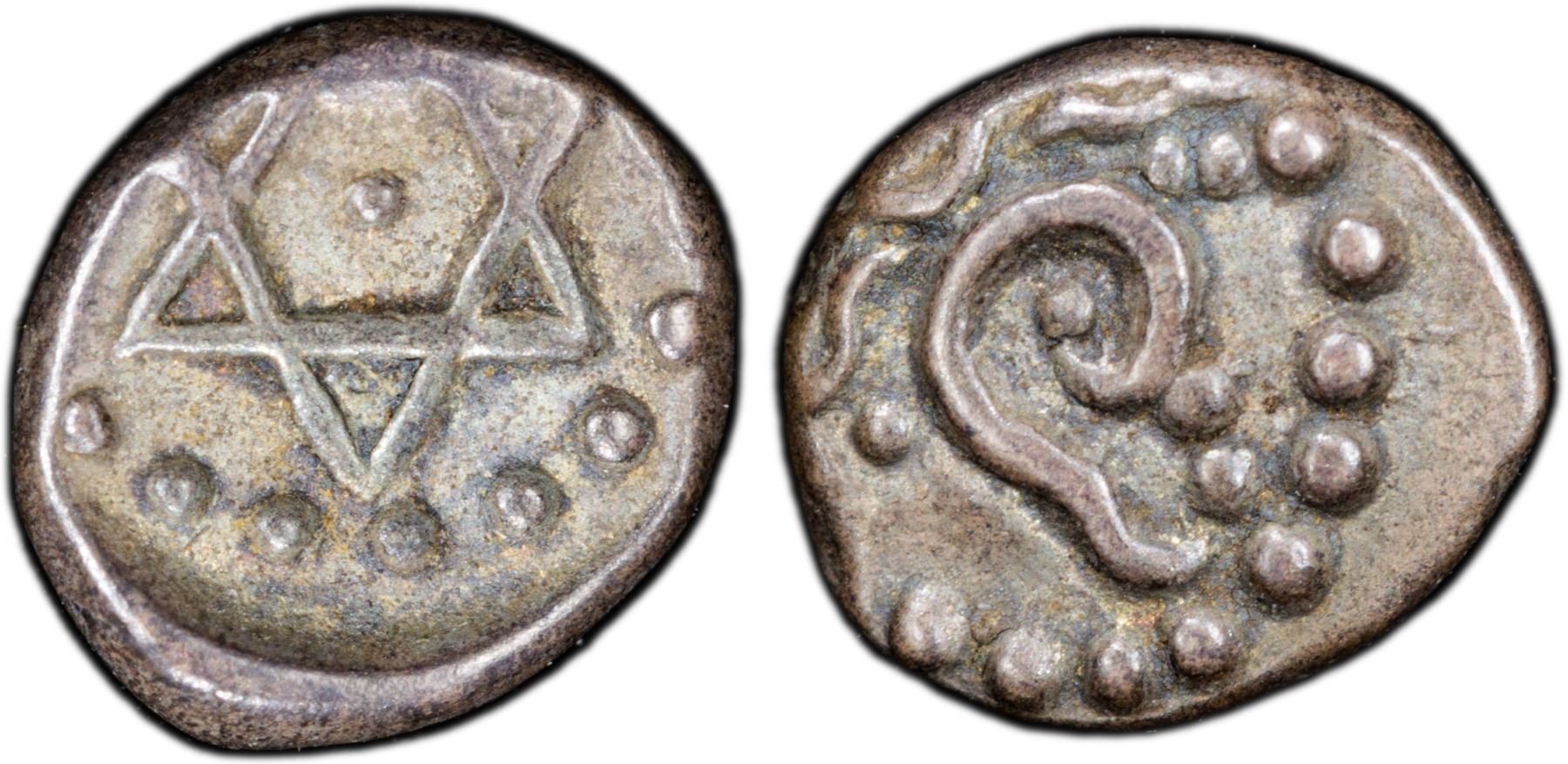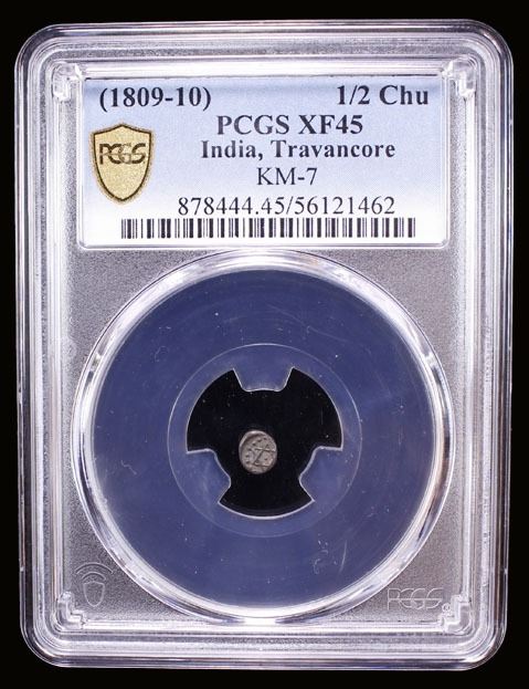 TRAVANCORE: Bala Rama Varma, 1798-1810, AR 1/2 chuckram (0.17g), ND (1809-10), KM-7, stylized Shanku (conch shell) within a circle of dots // Sudarshana chakram (spinning discus used by the Hindu God Vishnu), within a circle of dots, PCGS graded EF45. Avittam Thirunal Bala Rama Varma was the ruler of the Indian princely state of Travancore from 1798 to 1810, succeeding his uncle Karthika Thirunal Rama Varma (Dharma Raja) on 12 February 1798. His reign was a time of disturbances and internal and external problems. The revolt of Velu Thampi (who as Dewan negotiated the formal alliance between Travancore and the British East India Company) occurred during his rule. This is a very rare denomination and from a small group of 21 coins.