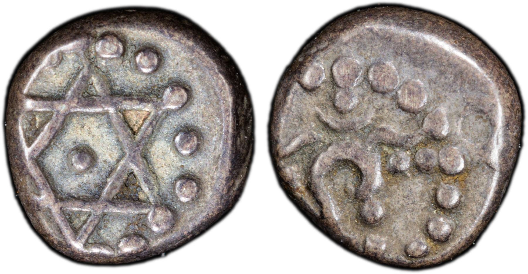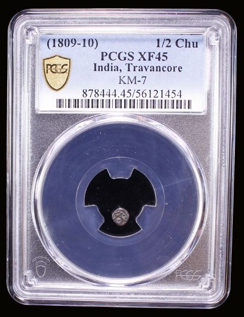 TRAVANCORE: Bala Rama Varma, 1798-1810, AR 1/2 chuckram (0.21g), ND (1809-10), KM-7, stylized Shanku (conch shell) within a circle of dots // Sudarshana chakram (spinning discus used by the Hindu God Vishnu), within a circle of dots, PCGS graded EF45. Avittam Thirunal Bala Rama Varma was the ruler of the Indian princely state of Travancore from 1798 to 1810, succeeding his uncle Karthika Thirunal Rama Varma (Dharma Raja) on 12 February 1798. His reign was a time of disturbances and internal and external problems. The revolt of Velu Thampi (who as Dewan negotiated the formal alliance between Travancore and the British East India Company) occurred during his rule. This is a very rare denomination and from a small group of 21 coins.