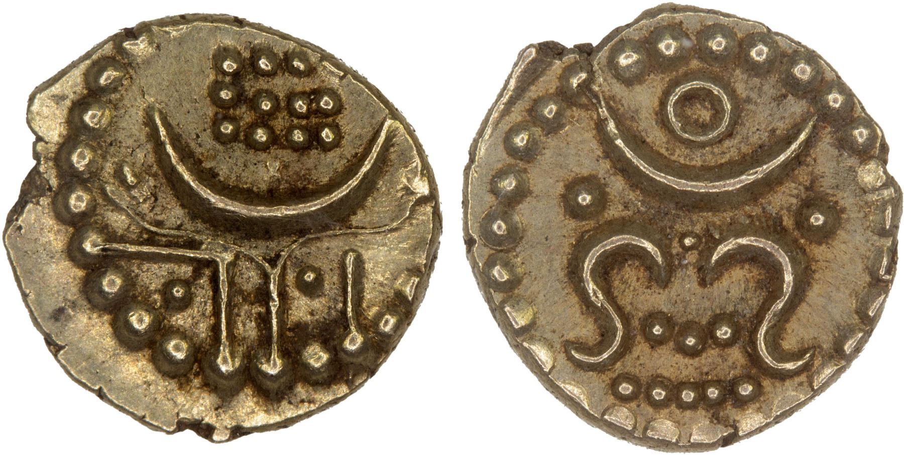 TRAVANCORE: Bala Rama Varma I, 1798-1810, AV anantaraya (fanam) (0.38g), KM-2, special strike of the finest quality, perhaps a pattern for an issue of Bala Rama Varma I or perhaps for a later ruler, NGC graded MS64, RR. Sarasan has assigned type KM-2 to the previous ruler Thirunal Rama Varma (1758-1798) (her type #171).