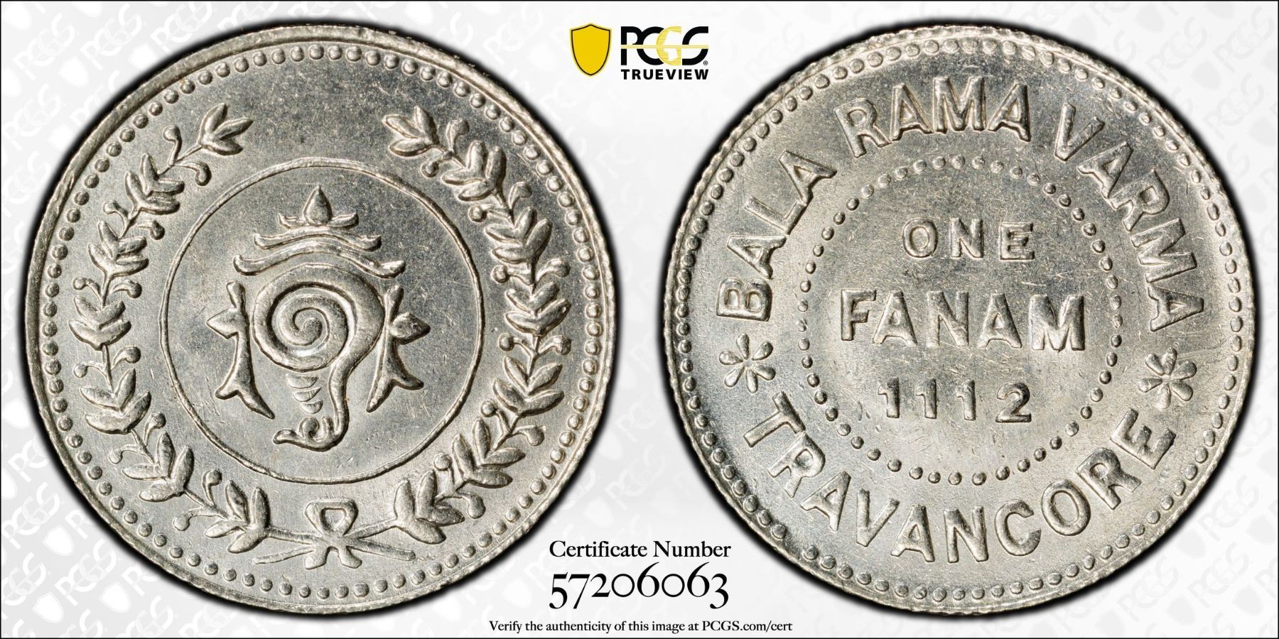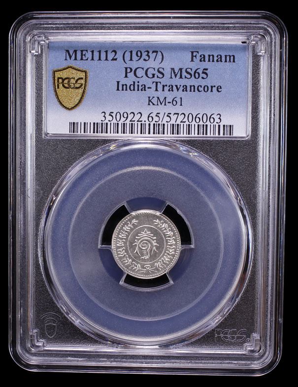 TRAVANCORE: Bala Rama Varma II, 1924-1949, AR fanam, ME1112 (1937), KM-65, a superb lustrous mint state example! PCGS graded MS65.
