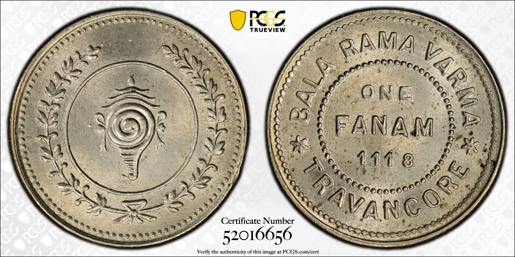 TRAVANCORE: Bala Rama Varma II, 1924-1949, AR fanam, ME1118 (1942), PCGS MS65