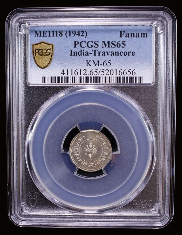 TRAVANCORE: Bala Rama Varma II, 1924-1949, AR fanam, ME1118 (1942), KM-65, Y-45a, a superb lustrous example! PCGS graded MS65.
