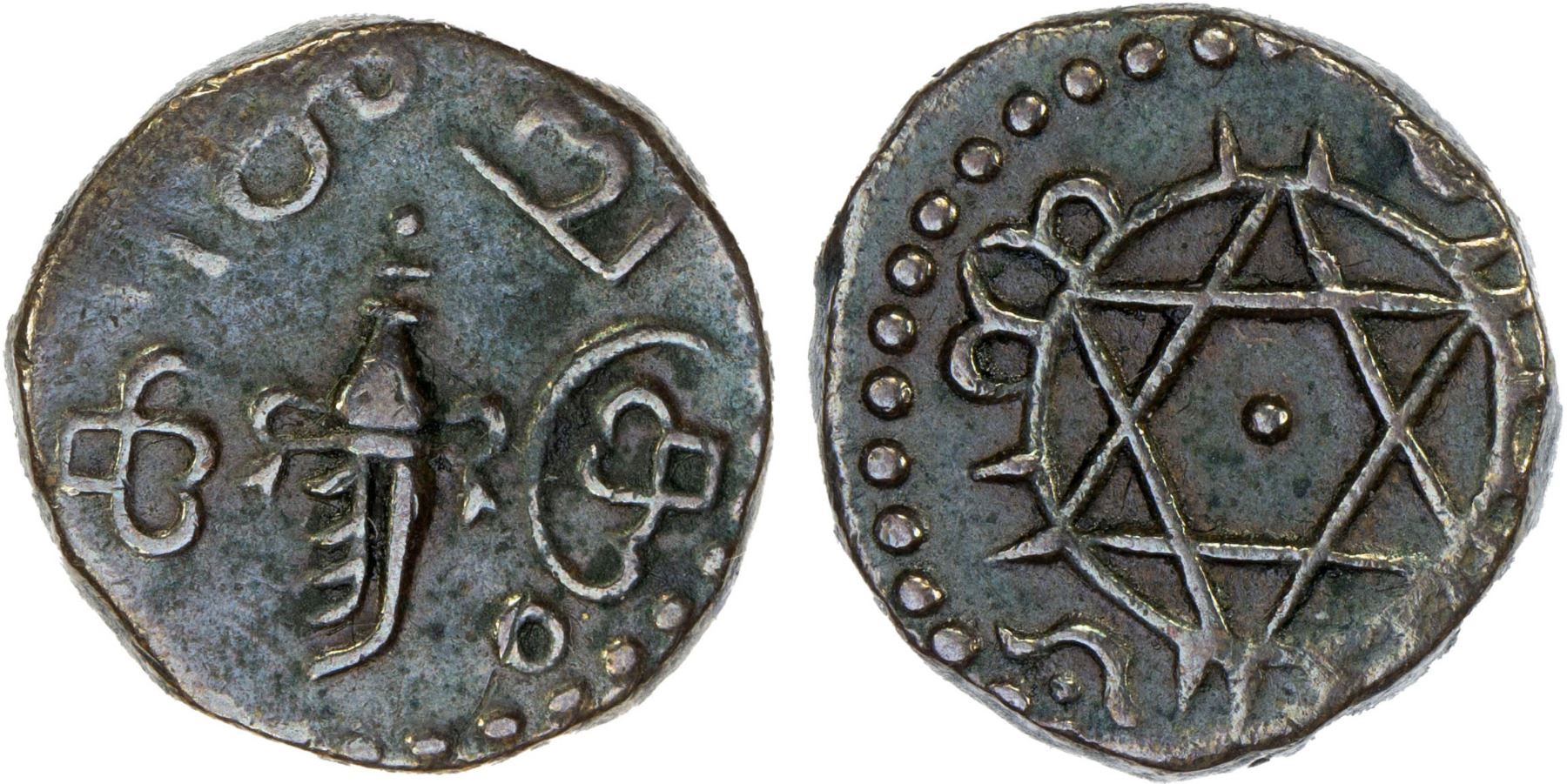 TRAVANCORE: Rama Varma VI, 1885-1924, AE 1/4 chuckram (2.51g), ND (1888/89), KM-35, cleaned, VF-XF.