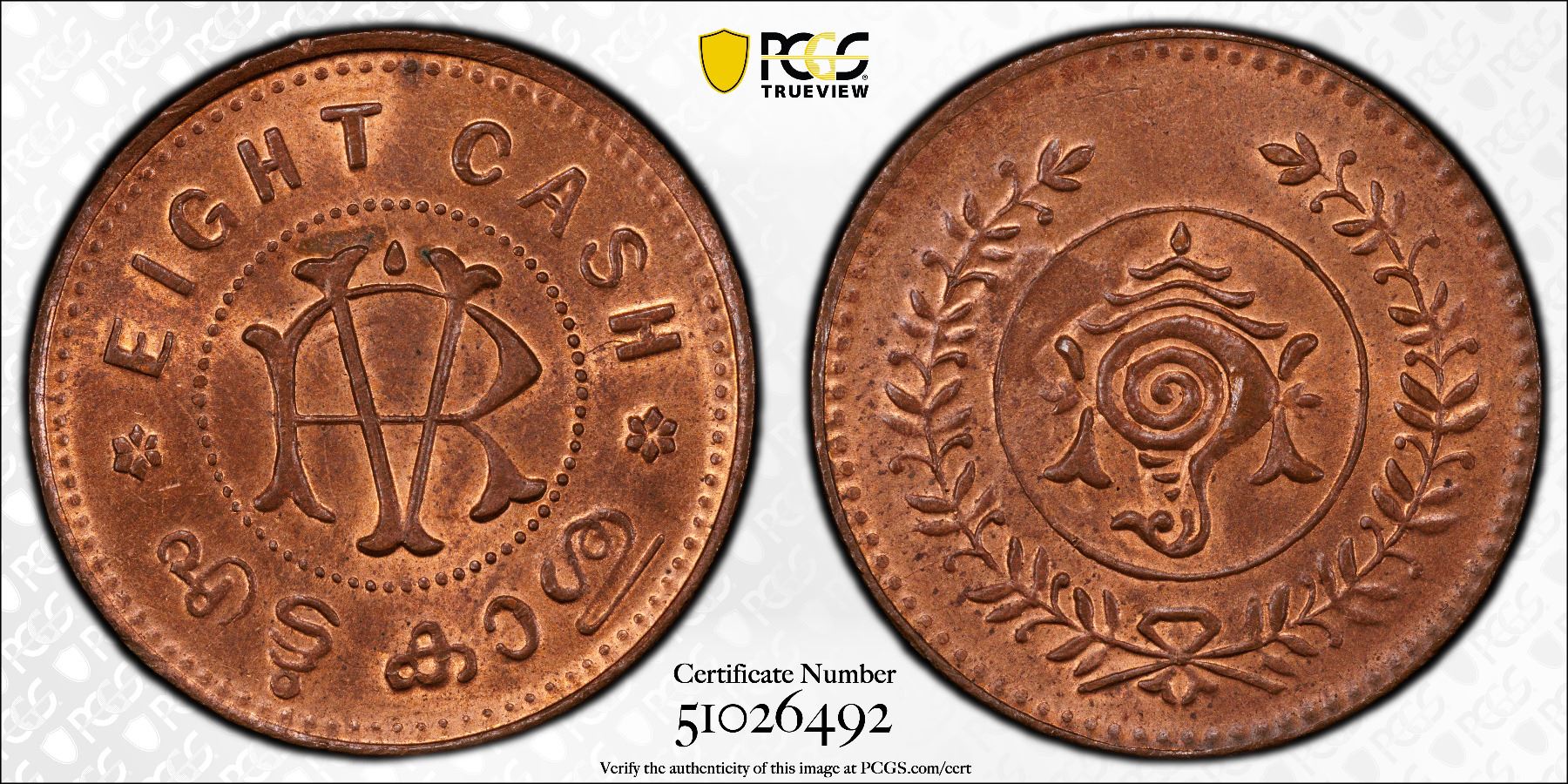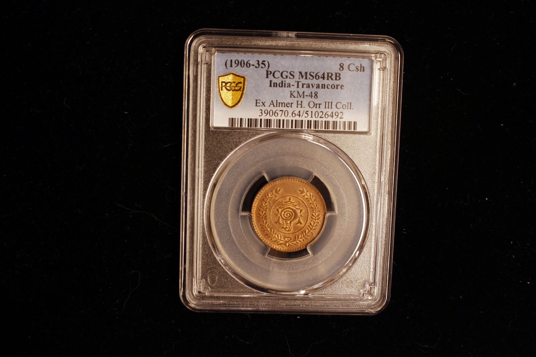 TRAVANCORE: Rama Varma VI, 1885-1924, AE 8 cash, ND (1906-35), Y-48, a wonderful red lustrous example! PCGS graded MS64 RB, ex Almer H. Orr III Collection.