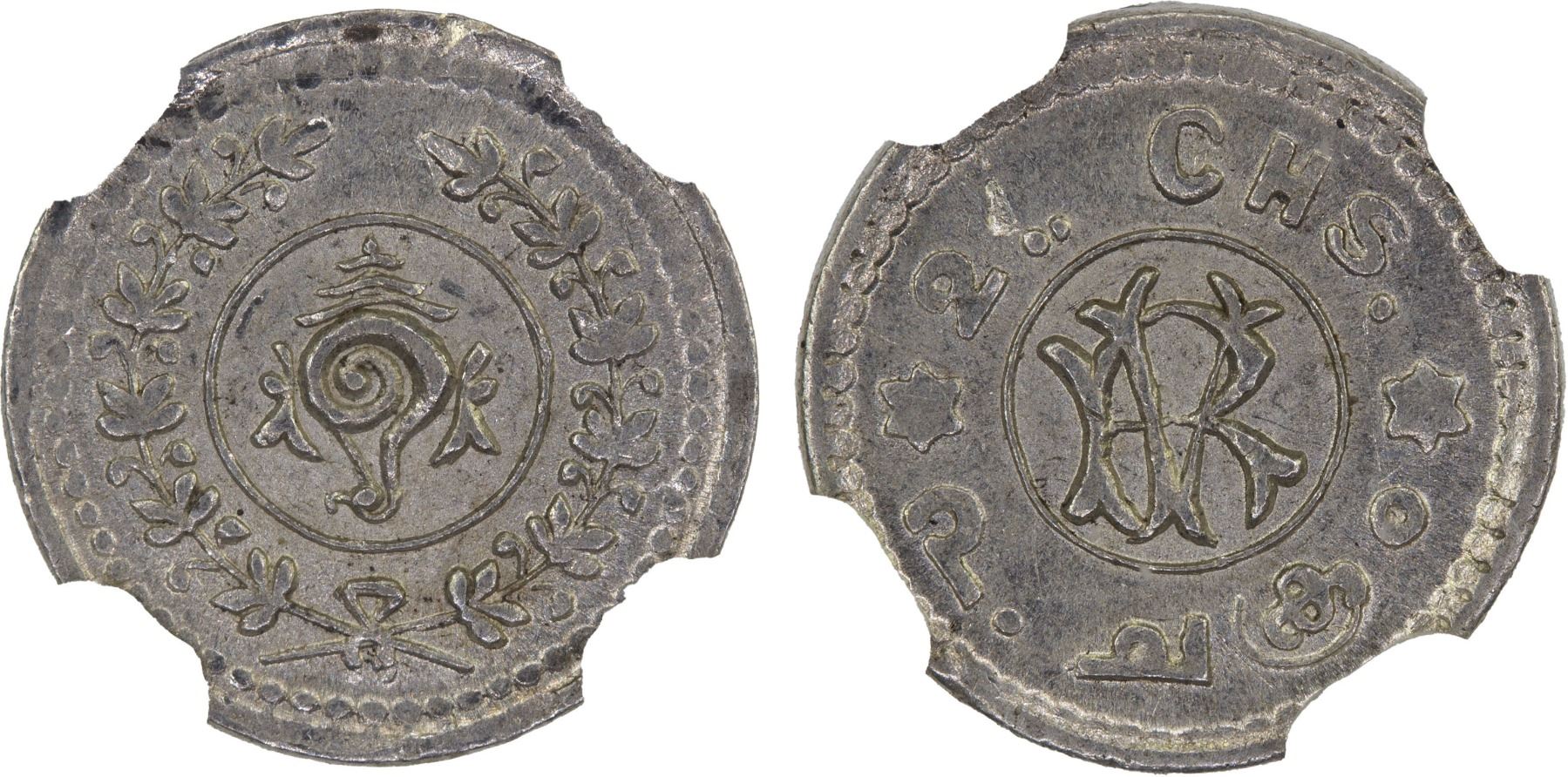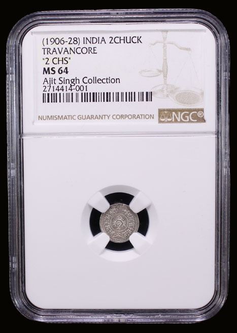 TRAVANCORE: Rama Varma VI, 1885-1924, AR 2 chuckrams, ND (1906-28), KM-50, legend reads "2 CHS," blast white luster, rare type, NGC graded MS64, ex SARC Auction 28 Lot 2806, ex Ajit Singh Collection, ex The 1914 Collection.
