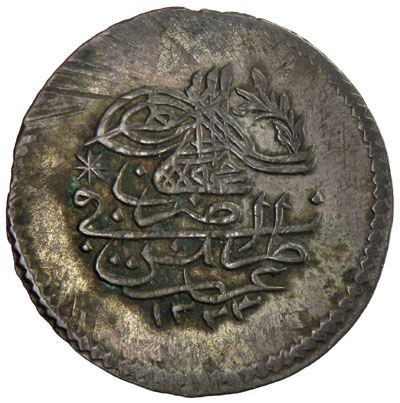 TRIPOLI: Mahmud II, 1808-1839, BI 40 para (10.00g), Tarabulus Gharb, AH1223 year 24, KM-215? USK-117.14, without outer margins as on USK-117.17, which represents KM-215, lovely bold strike, with two 8-spoke wheels in the reverse field, bold Very Fine, RR, ex. Ken Bovenkamp collection. The "scratches" in the obverse field are weight adjustment marks, not damage to the coin.