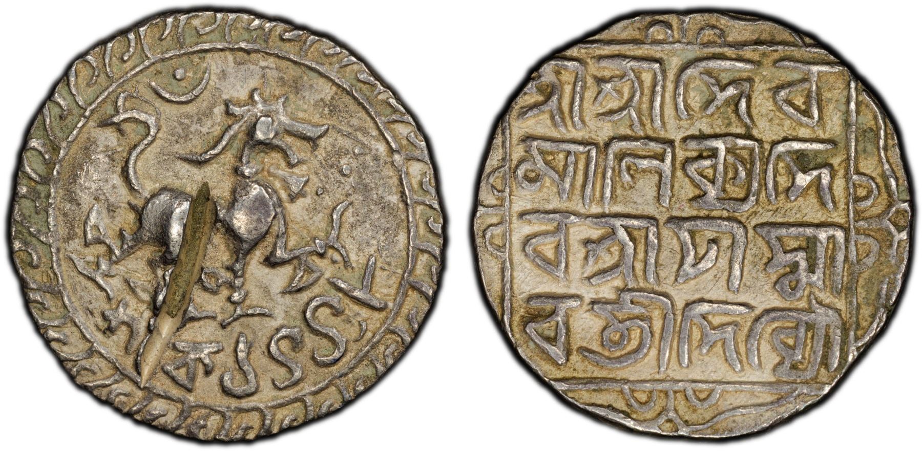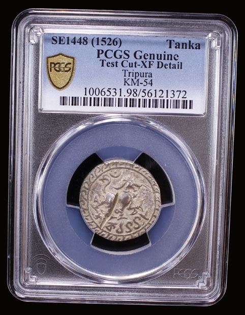 TRIPURA: Deva Manikya, 1526-1532, AR tanka (10.72g), SE1448 (1526), KM-54, R&B-76, citing Queen Padmavati, lion facing right, crescent and bead above, date below within circle and fin-like border // Sri Sri Deva / Manikya De / va Sri Padma / vati Devyau within square with decorative border, test cut on obverse, otherwise a charming example of this rare issue, PCGS graded XF details, ex Nicholas Rhodes Collection, Lot 47, Sept. 27, 2016.