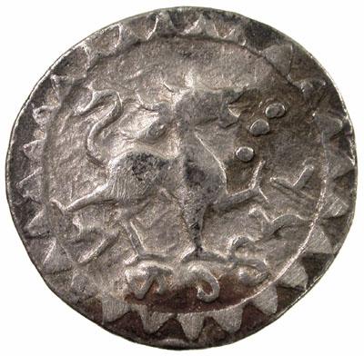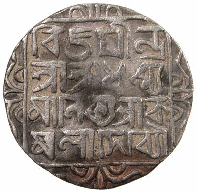 TRIPURA: Dhanya Manikya, 1490-1526, AR tanka (10.39g), SE1428, KM-—, R&B-66, lion right, victory commemorative with his new title Vijayindra, citing Queen Kamala, three large pellets added before the lion's mouth, choice Very Fine, RR, ex. Eck Prud'homme collection.  Similar to KM-47 but with the lion facing right rather than left.