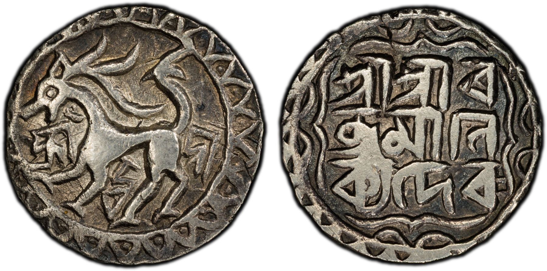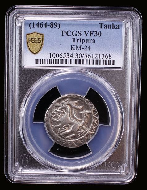 TRIPURA: Ratna Manikya, 1454-1489, AR tanka (10.32g), ND, KM-24, R&B-38, lion facing left, toothed border, sri durga in the field // 3-line legend sri sri ratna manikya deva in decorated quatrefoil border, PCGS graded VF30, ex David Cashin Collection, ex SARC Auction 45 Lot 960.