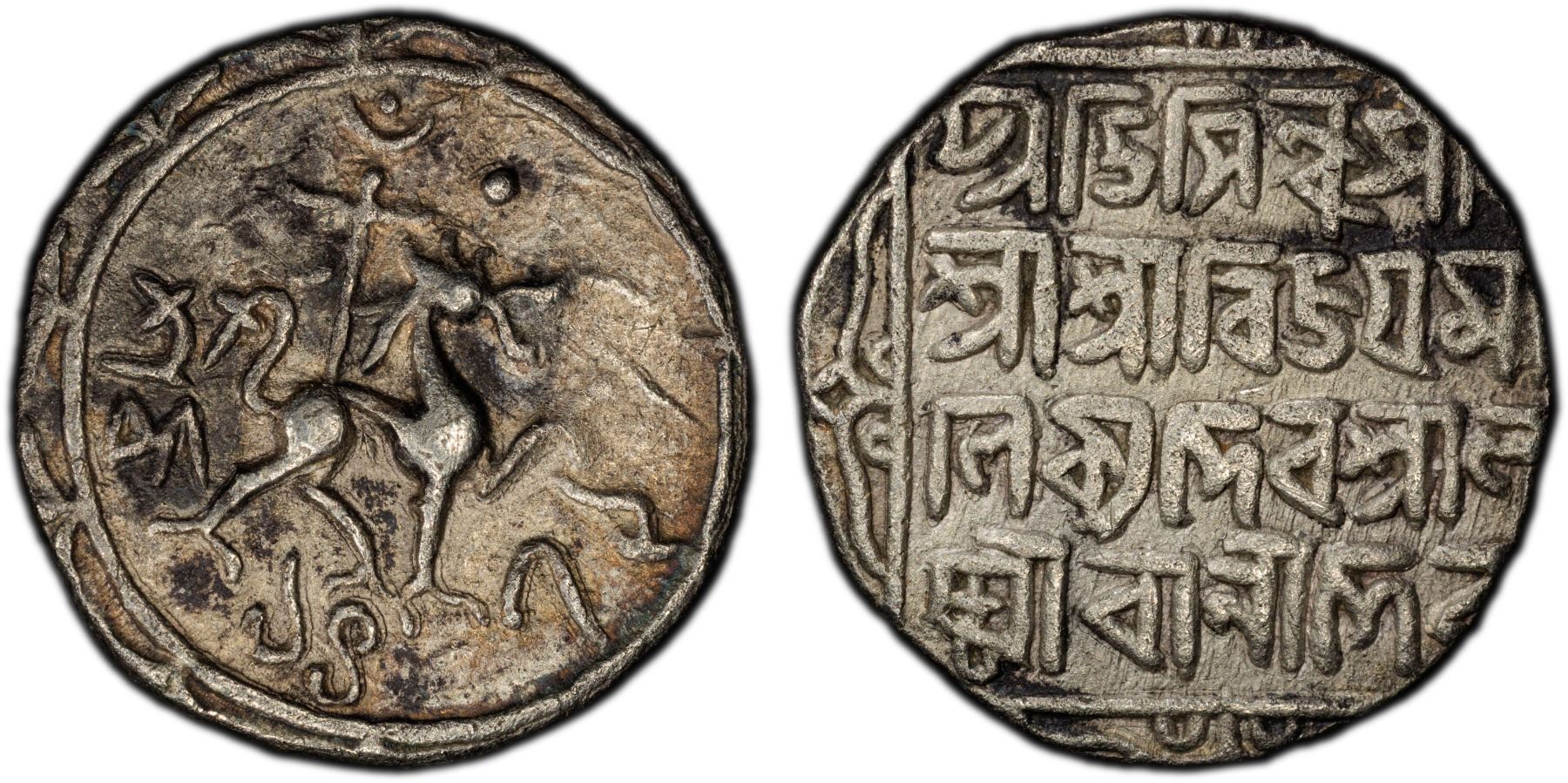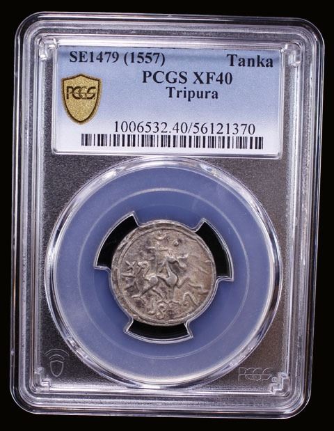 TRIPURA: Vijaya Manikya, 1532-1564, AR tanka (10.78g), SE1479 (1557), KM-65, R&B-113, lion facing right with pellet at upper right, floral border // 5-line legend pratisindhu sim sri sri vijaya manikya deva sri lakshmi rana devya, citing Queen Lakshmi, bold strike, PCGS graded EF40, ex David Cashin Collection, ex SARC Auction 45 Lot 969.