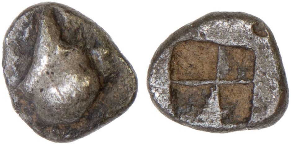 TROAS: Neandria, AR tetartemorion (0.14g), late 6th-5th century BC, cf. Rosen-109 (Skione, obol), SNG Arikantürk 664-65 (obol), corinthian helmet left // quadripartite incuse square, unpublished and rare, VF, ex James Lamb Collection. Tentatively attributed to Neandria. See Nomos Auction 39, Lot 298 for a similar example.