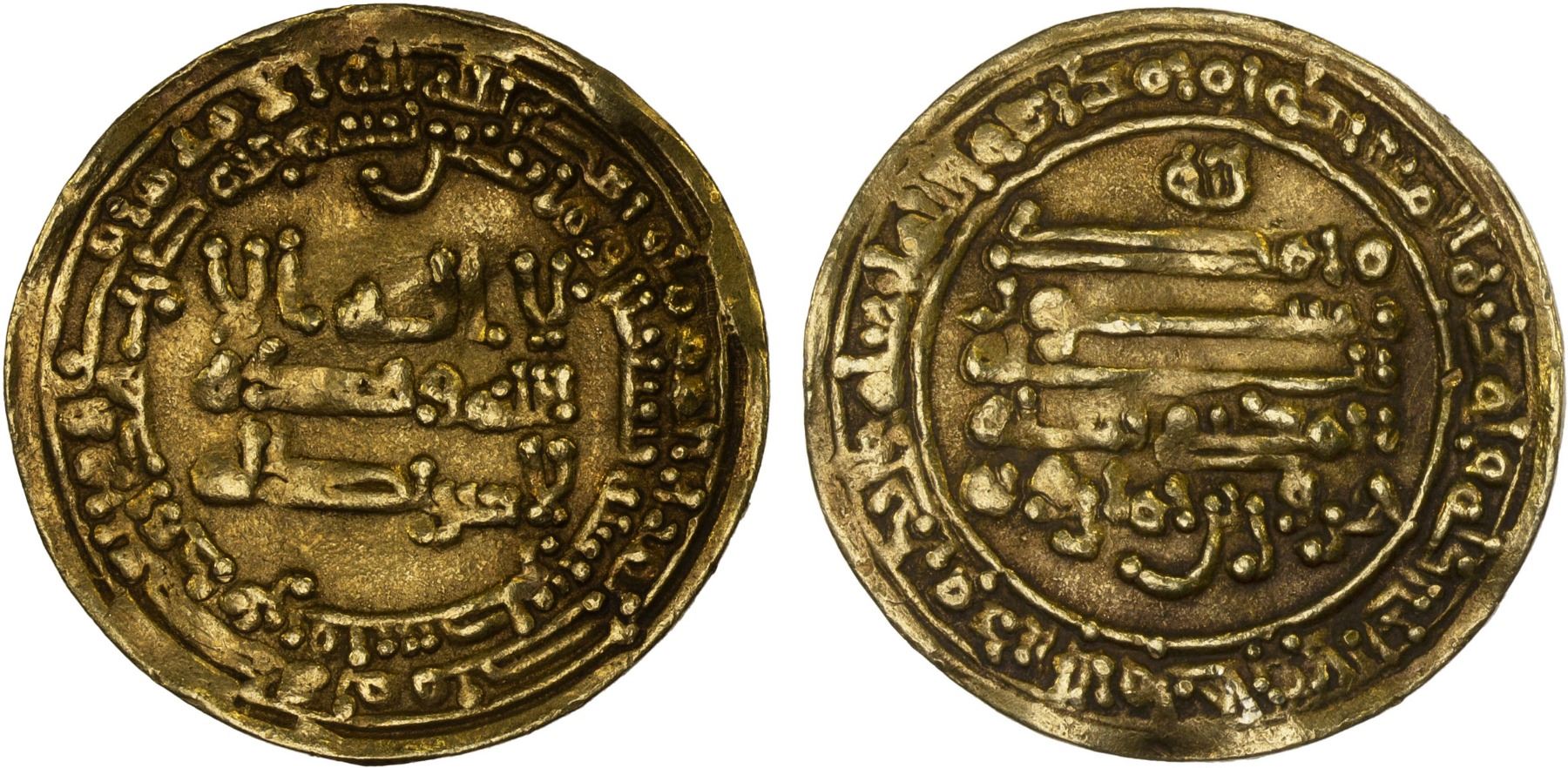 TULUNID: Harun b. Khumarawayh, 896-905, AV dinar (4.08g), Hims, AH287, A-667, slightly uneven surfaces but a very bold strike, rare mint for the Tulunids; minor weakness in the margins, XF, RR.