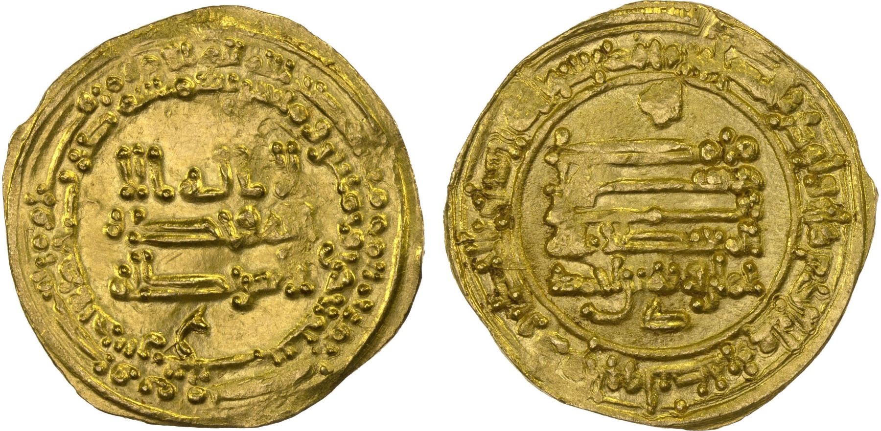 TULUNID: Khumarawayh b. Ahmad, 884-896, AV dinar (4.42g), Halab, AH281, A-664, with the letter "k" below the reverse field; very rare mint and with traces of original luster, XF-AU, RR.