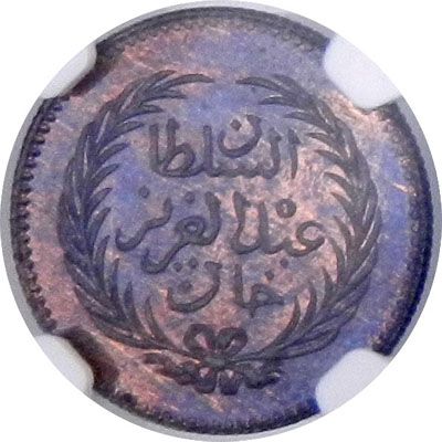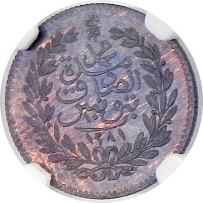 TUNIS: Abdul Aziz + Muhammad Sadiq Khan, 1860-1876, "Tunis", AH1281, KM-Pn9, copper pattern for the gold 10 piastre, type KM-150, struck at the Heaton Mint, Birmingham, NGC graded Proof 65 BN, RR.