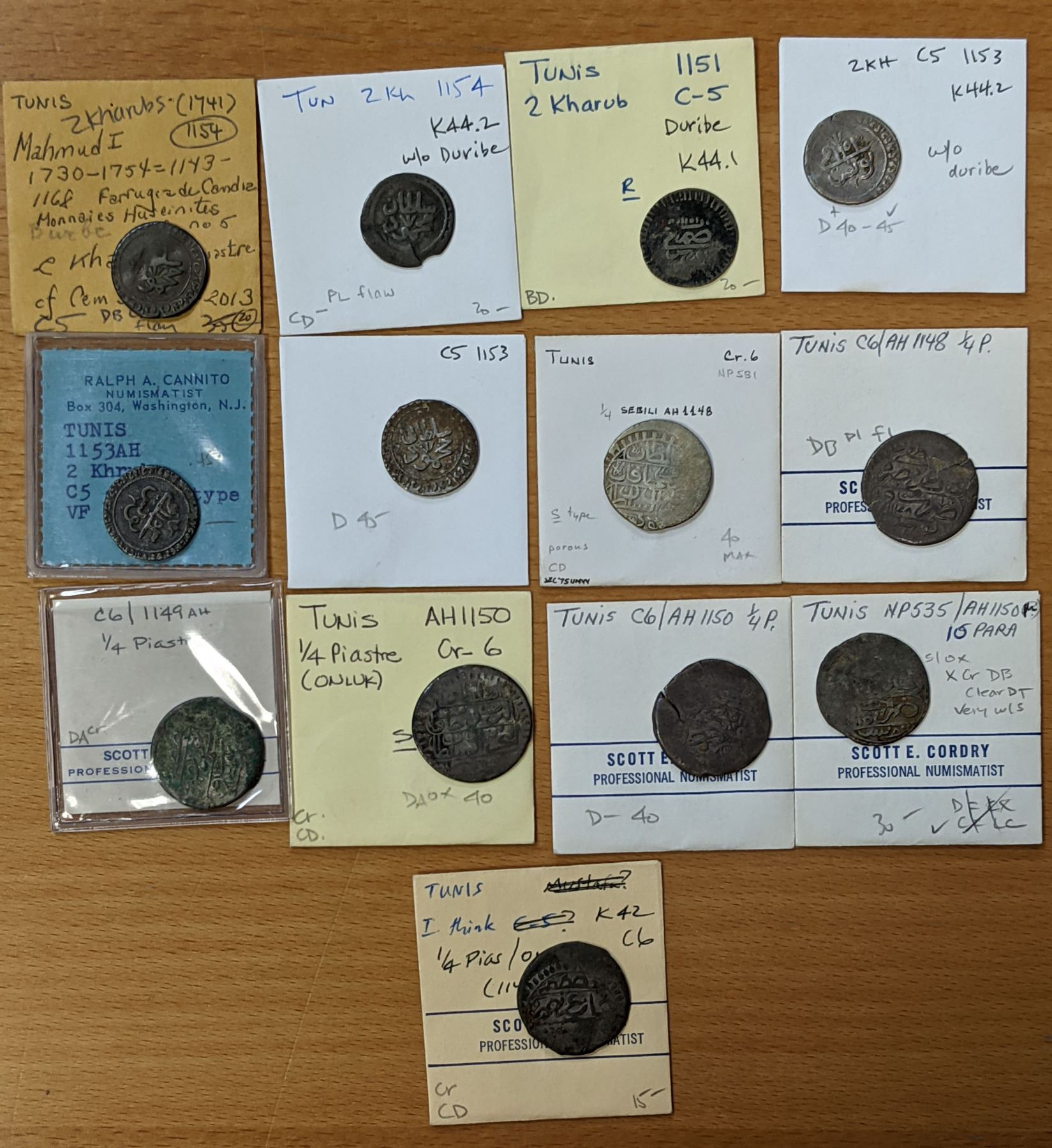 TUNIS:LOT of 13 silver coins of Mahmud I (1730-1754): AR 2 kharub, KM-44.1, AH1151 (Fair); KM-44.2, 1153 (3 pcs, all nice VF), and 1154 (2 pcs, both Good); and AR ¼ piastres, KM-42, AH1148 (2), 1149 (1), 1150 (3) and date off flan (1) (all average Good to VG); retail value $350, lot of 13 pieces.