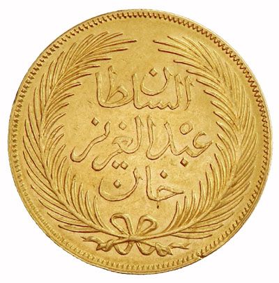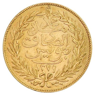 TUNIS: Muhammad al-Sadiq & Abdul Aziz, 1860-1876, AV 100 piastres, Tunis, AH1279, KM-149, About Unc.