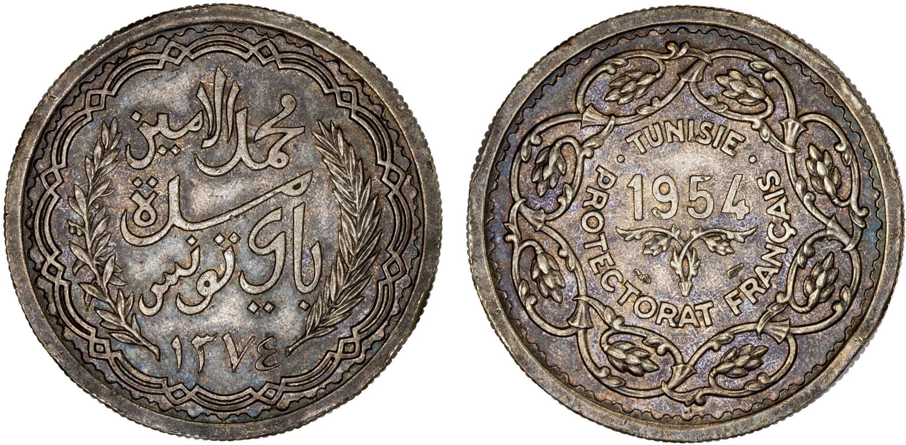 TUNISIA: AR 20 francs, 1954/AH1374 (a), KM-X2, rim nick, low mintage of 303 pieces, AU.