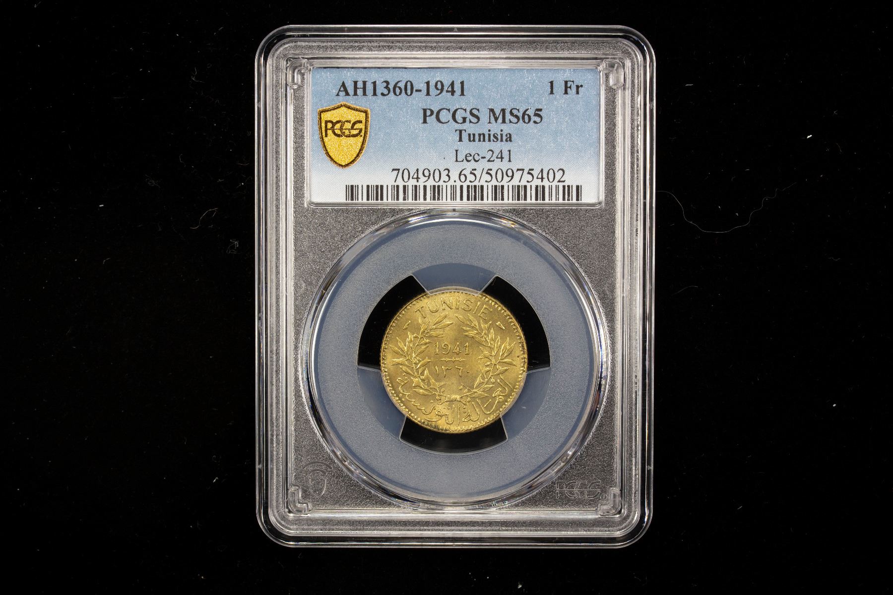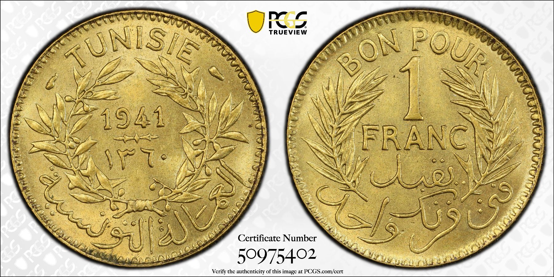 TUNISIA: Ahmad II, 1929-1942, 1 franc, 1941/AH1360, PCGS MS65