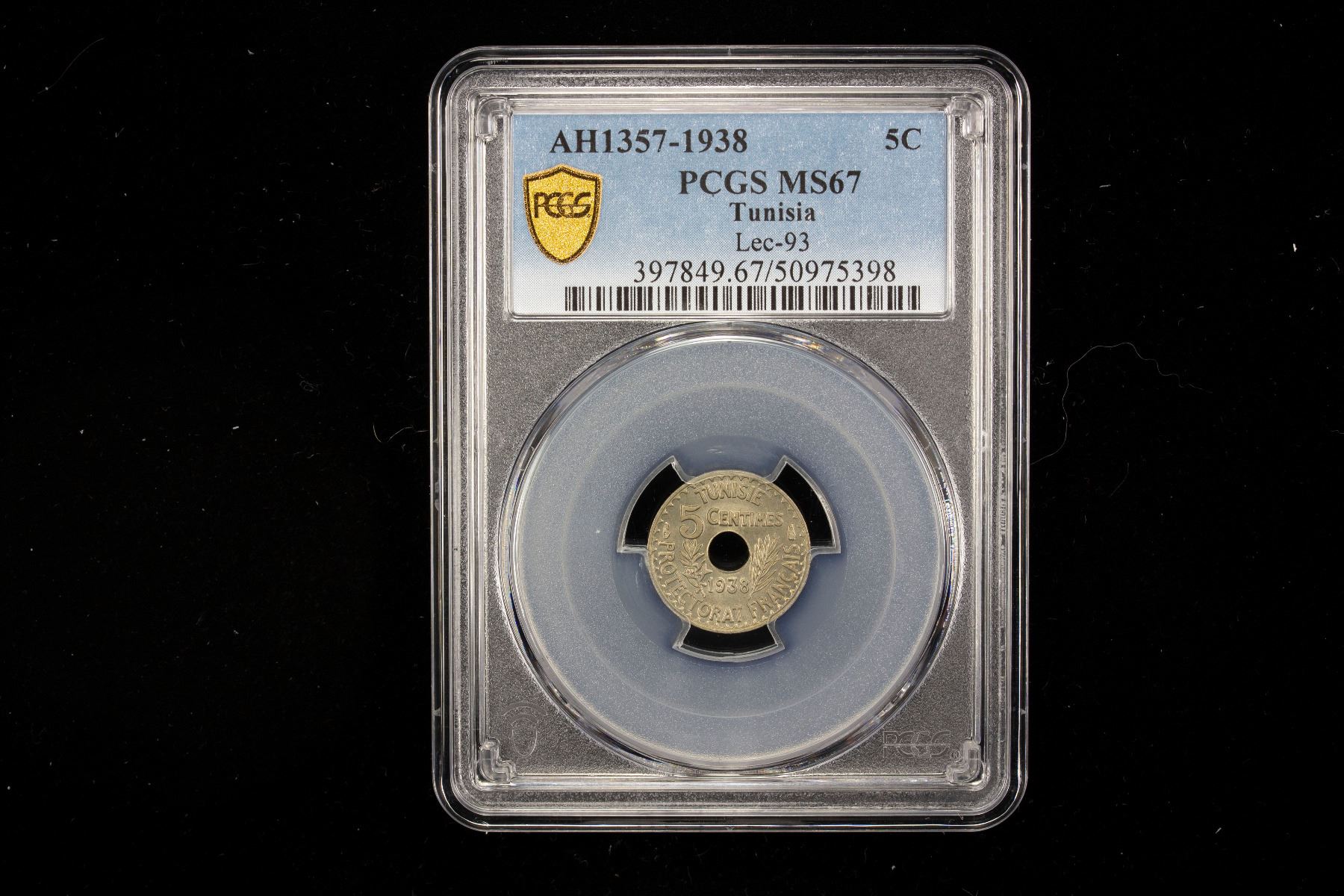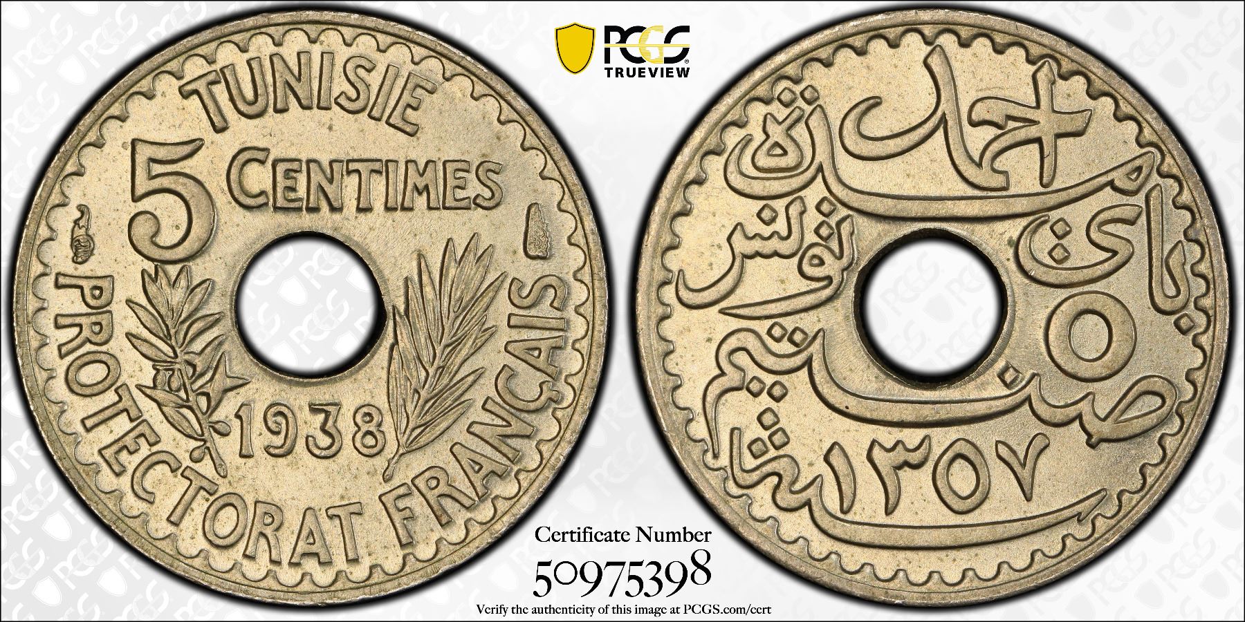 TUNISIA: Ahmad II, 1929-1942, 5 centimes, 1938/AH1357, PCGS MS67