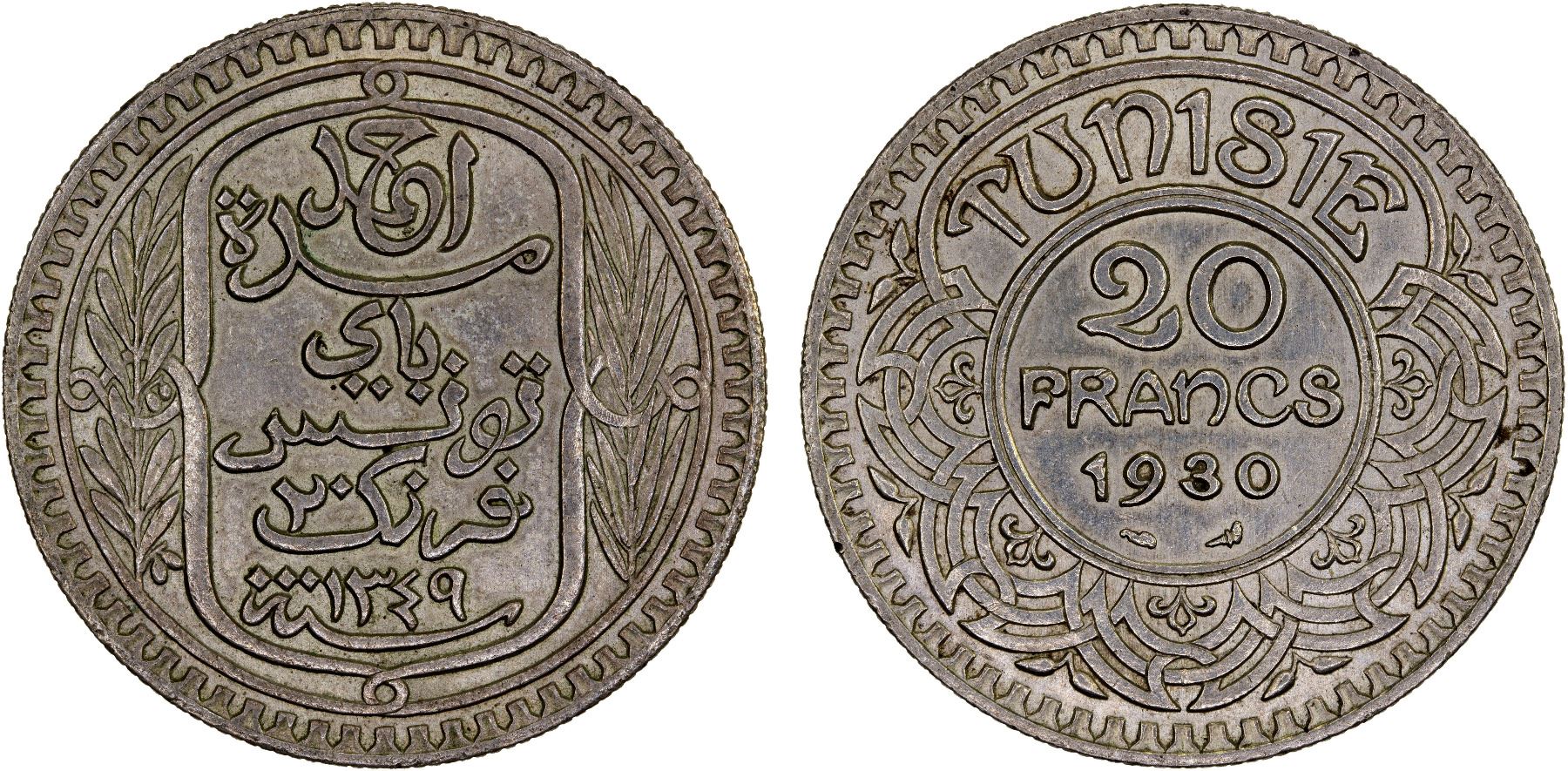TUNISIA: Ahmad Pasha Bey, 1929-1942, AR 20 francs, 1930/AH1349, AU