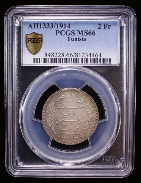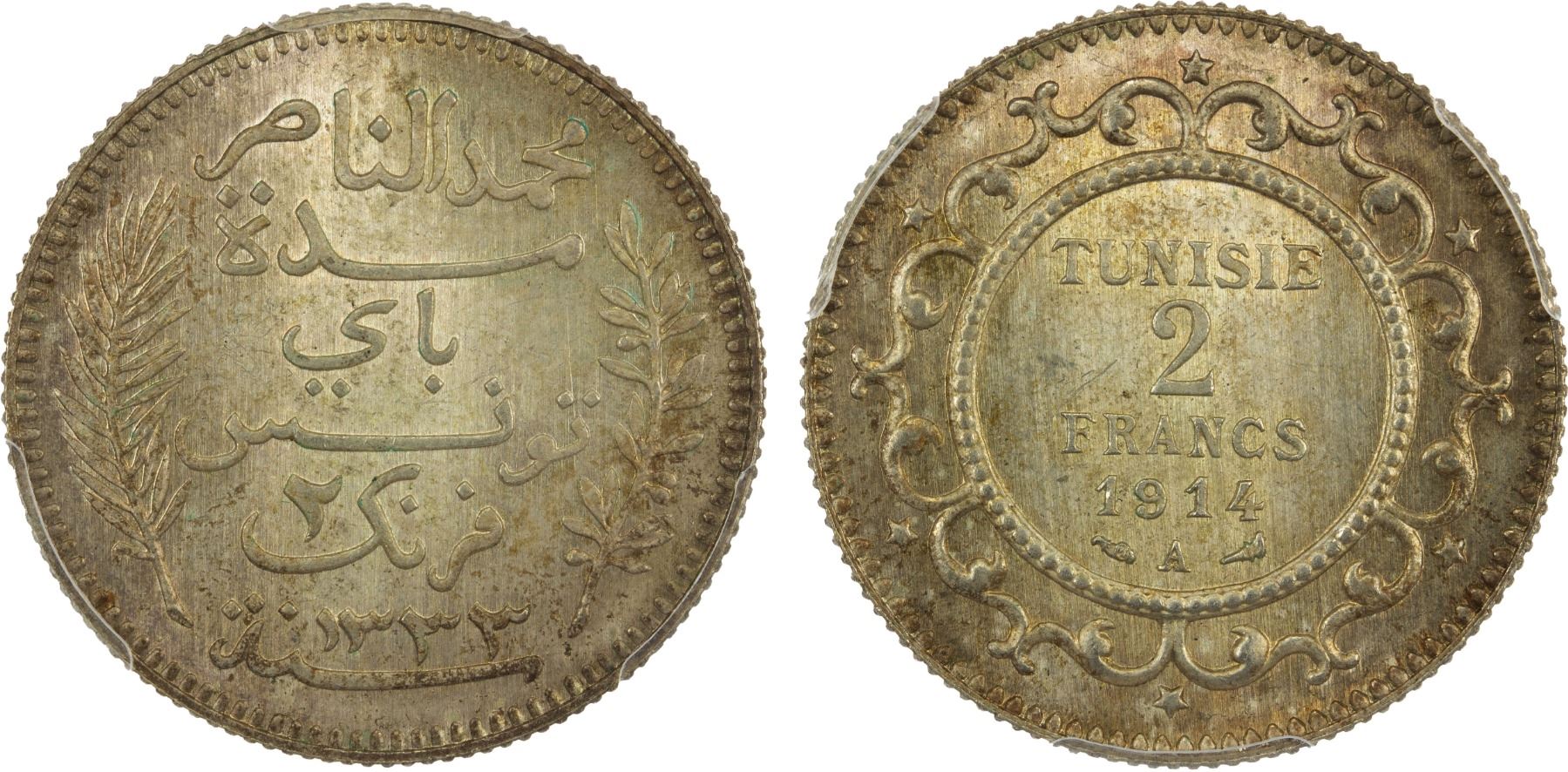 TUNISIA: French Colony, AR 2 francs, Paris, 1914/AH1333-A, KM-239, Lecompte-273, lightly toned and attractive, mintage of only 303 pieces, rare, a lovely example! PCGS graded MS66, ex The 1914 Collection. Finest graded at NGC and PCGS.