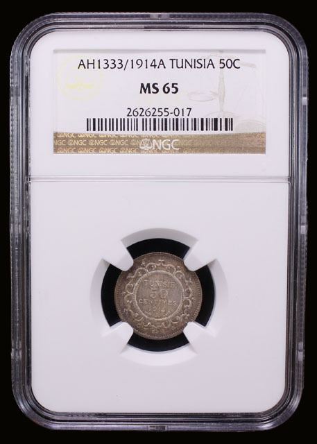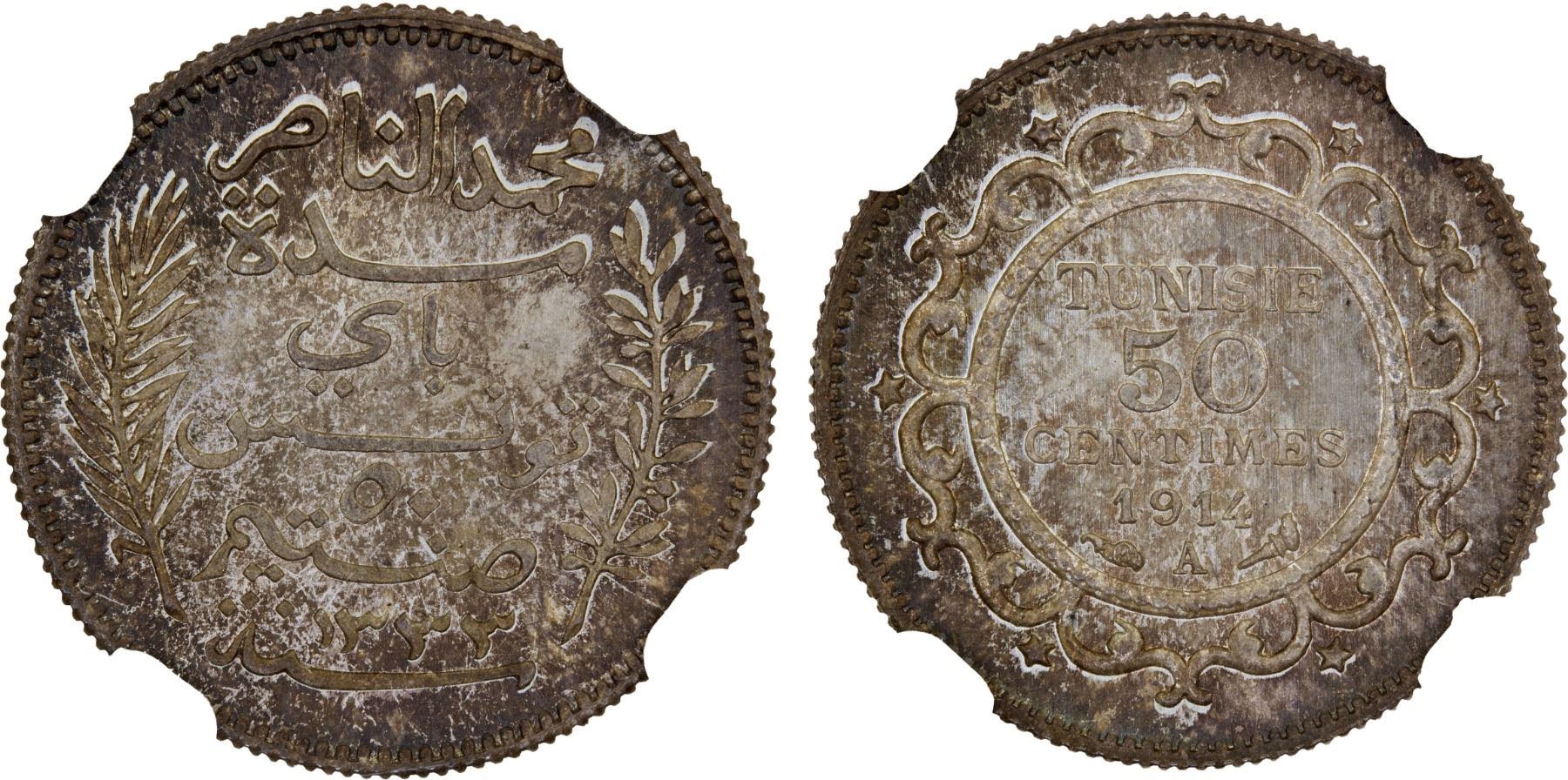 TUNISIA: French Colony, AR 50 centimes, Paris, 1914/AH1333-A, KM-237, Lecompte-162, mottled russet toning, only 1,003 pieces minted, scarce, NGC graded MS65, ex The 1914 Collection. Finest graded at NGC and PCGS.