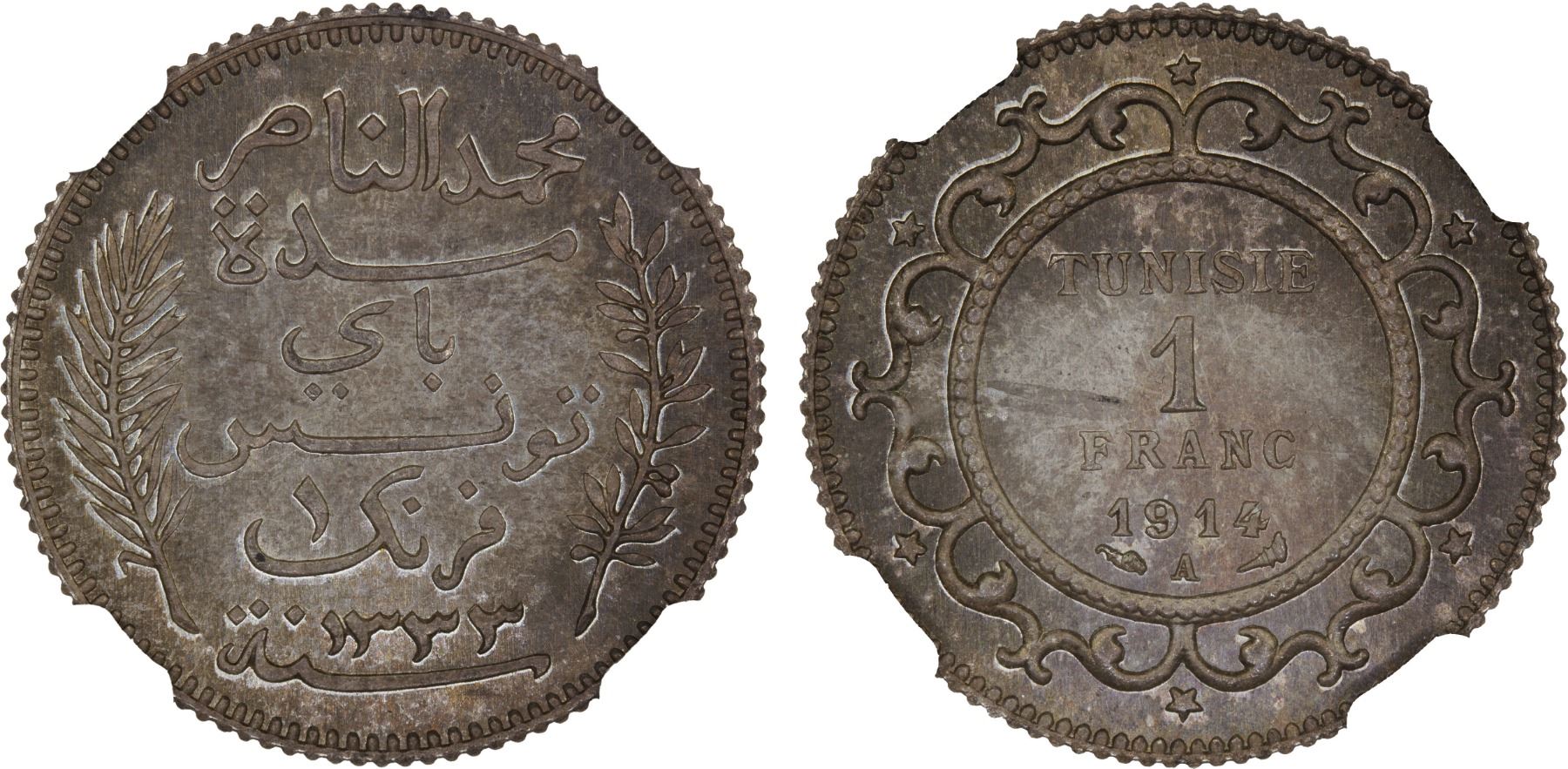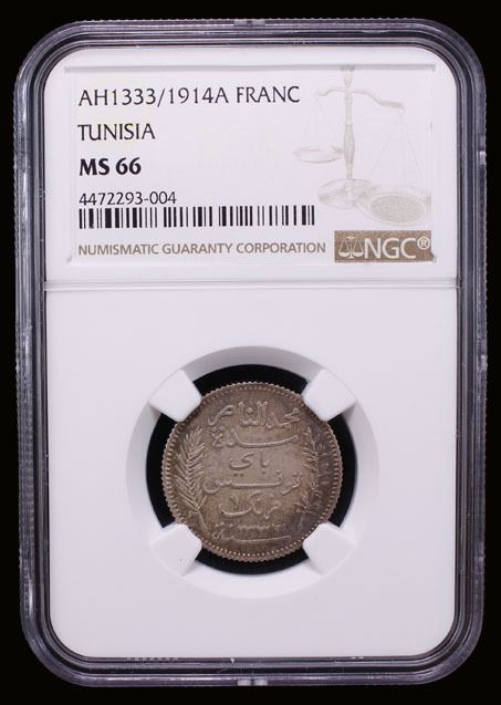 TUNISIA: French Colony, AR franc, Paris, 1914/AH1333-A, KM-238, Lecompte-216, nice pastel tones, only 703 pieces minted, rare, a lovely example! NGC graded MS66, ex The 1914 Collection. Finest graded at NGC and PCGS.