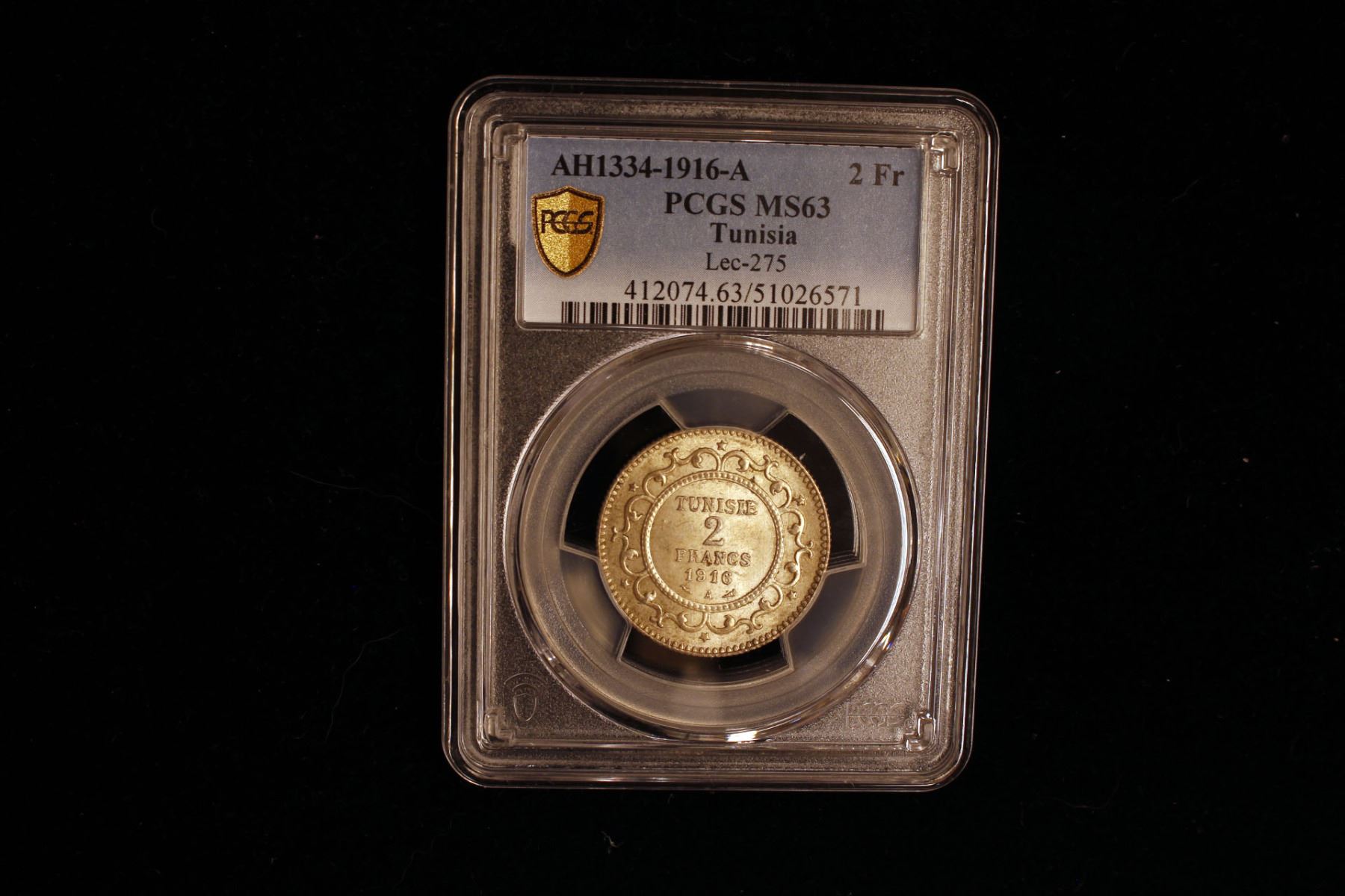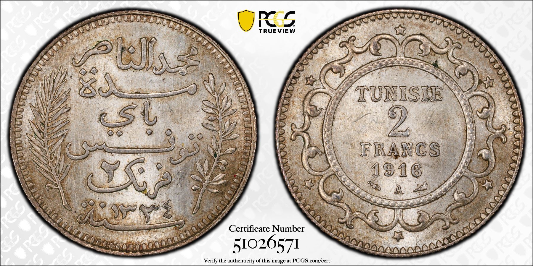 TUNISIA: Muhammad V, 1906-1922, AR 2 francs, 1916/AH1334, KM-239, struck at the Paris mint, a lovely lustrous example! PCGS graded MS63.