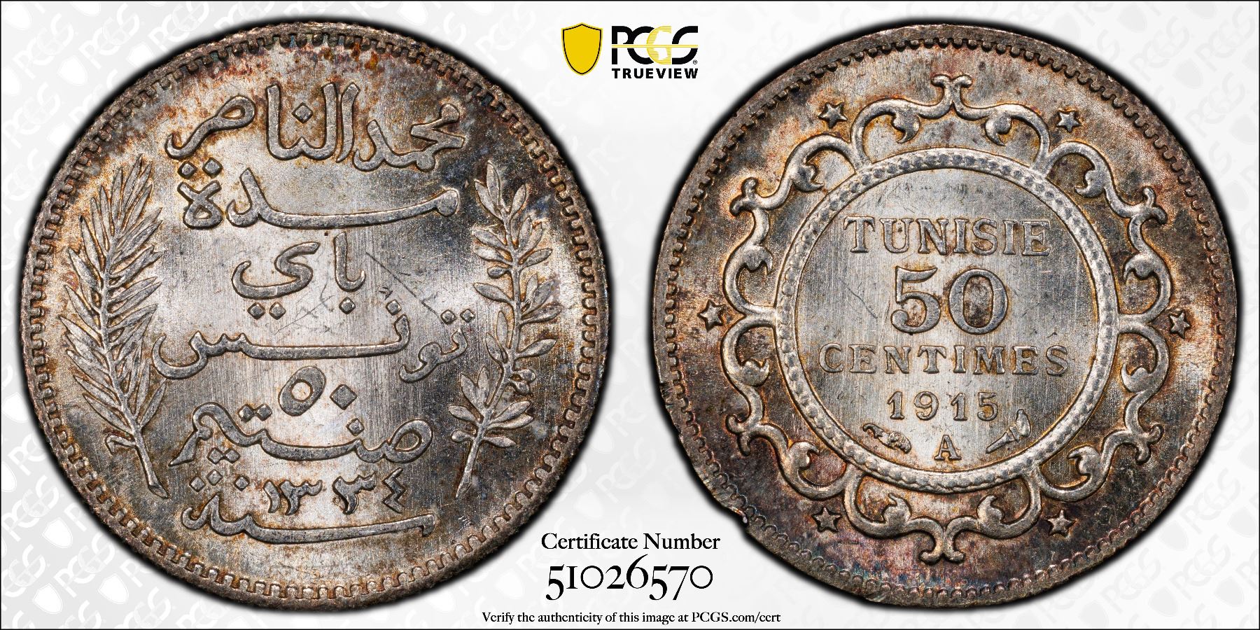 TUNISIA: Muhammad V, 1906-1922, AR 50 centimes, 1915/AH1334, PCGS MS64