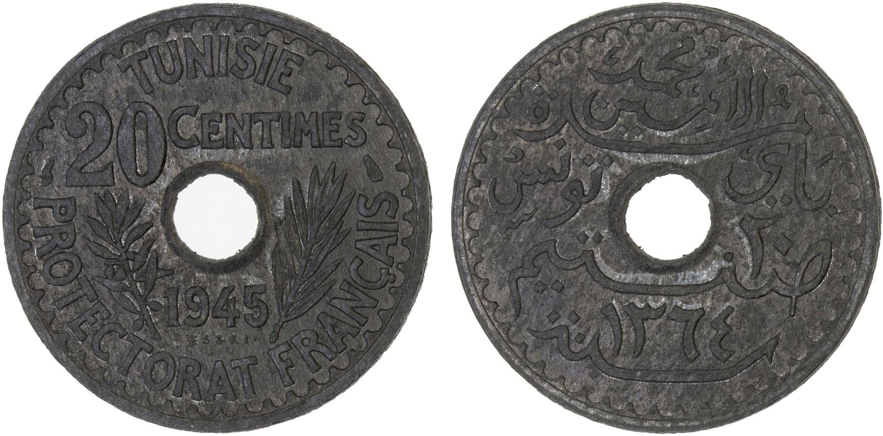 TUNISIA: Muhammad VIII, 1943-1956, 20 centimes, 1945/AHY1364, KM-PE1, Lec-125, piedfort (piéfort) essai issue, deep toned with traces of luster, Unc.