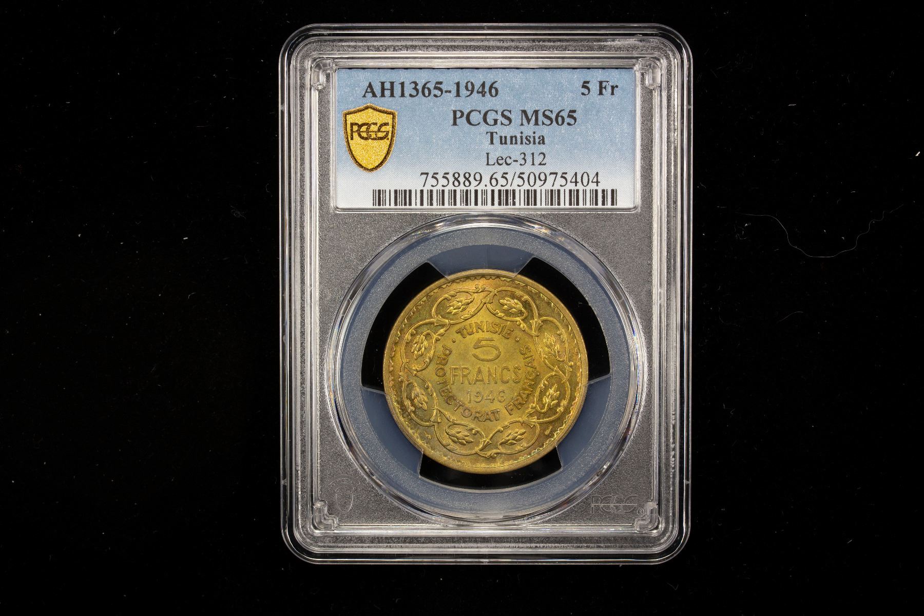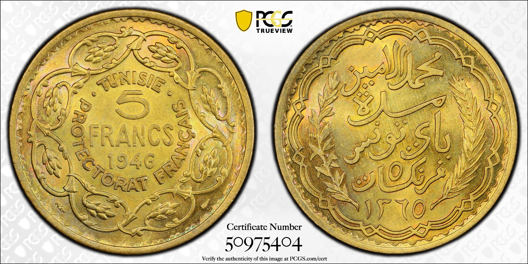 TUNISIA: Muhammad VIII, King 1956-1957, 5 francs, 1946/AH1365, PCGS MS65