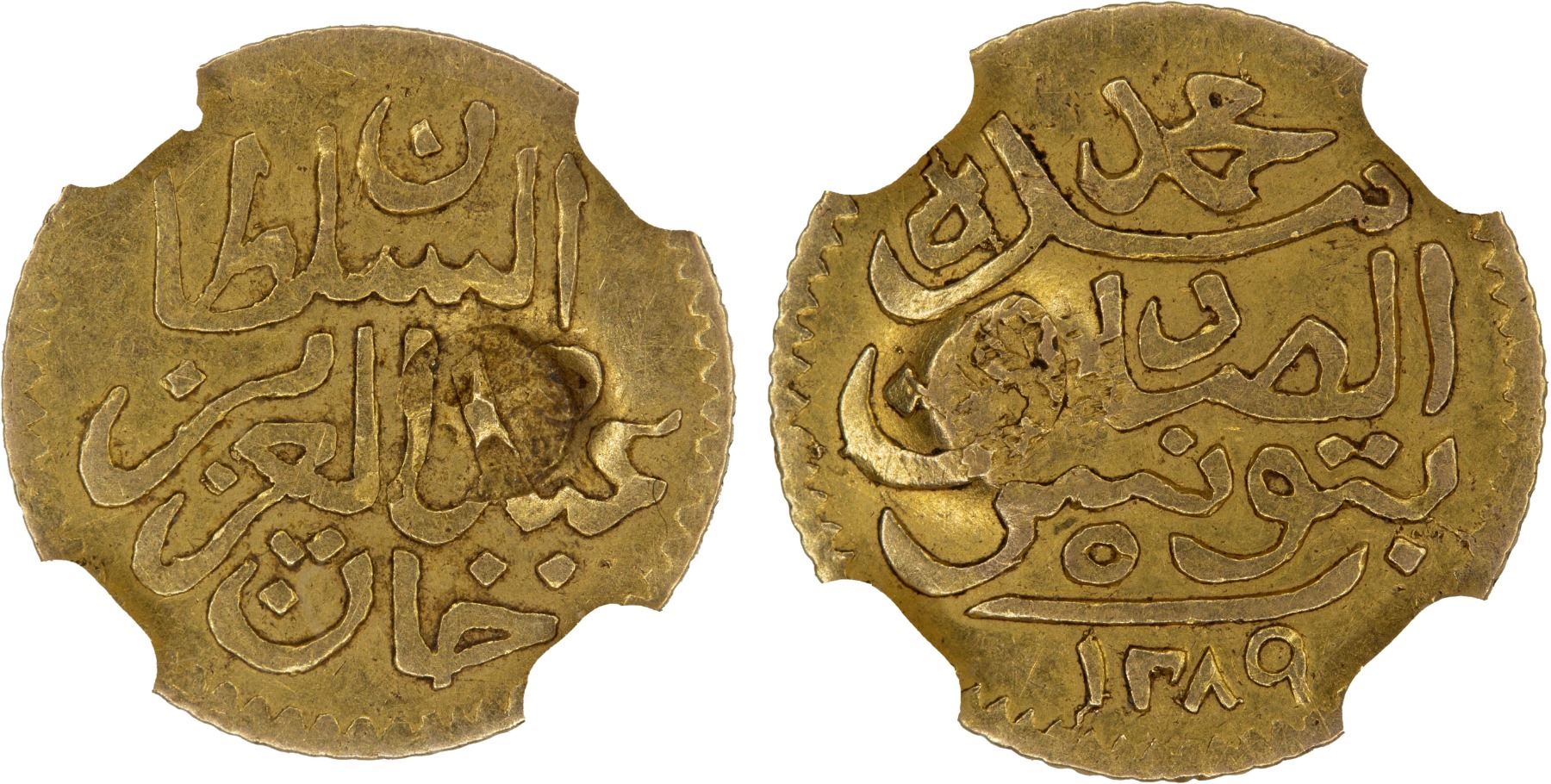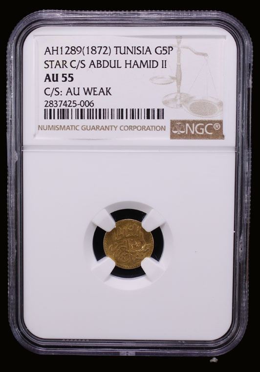 TUNISIA: Muhammad al-Sadiq Bey, 1859-1882, AV 5 piastres, Tunis, AH1289, KM-170, with the star countermark, citing the Ottoman sultan Abdul Aziz, NGC graded AU55.