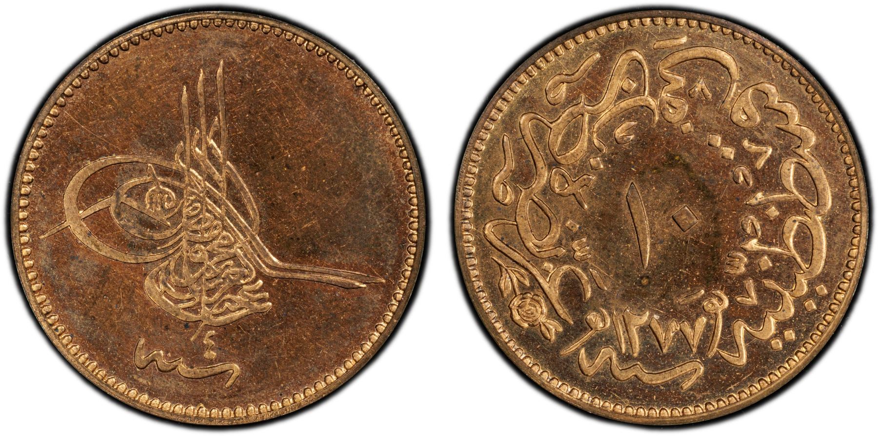 TURKEY: Abdul Aziz, 1861-1876, AE 10 para, Kostantiniye, AH1277 year 4, KM-700, a wonderful proof quality example! PCGS graded PF64 RB.