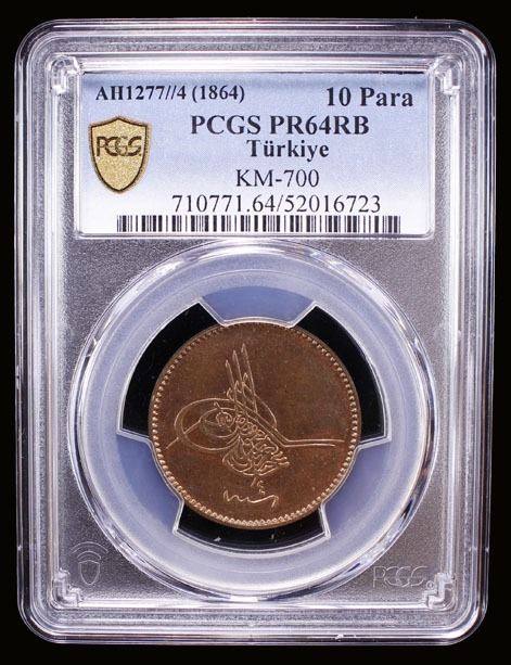 TURKEY: Abdul Aziz, 1861-1876, AE 10 para, Kostantiniye, AH1277 year 4, PCGS PF64 RB