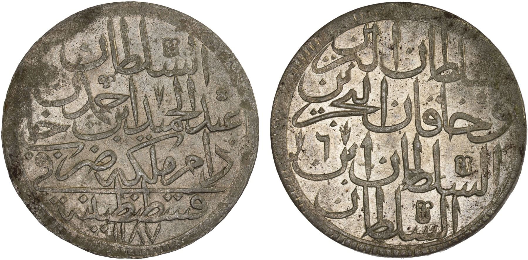 TURKEY: Abdul Hamid I, 1774-1789, AR 2 zolota (60 para), Kostantiniye, AH1187 year 6, Unc