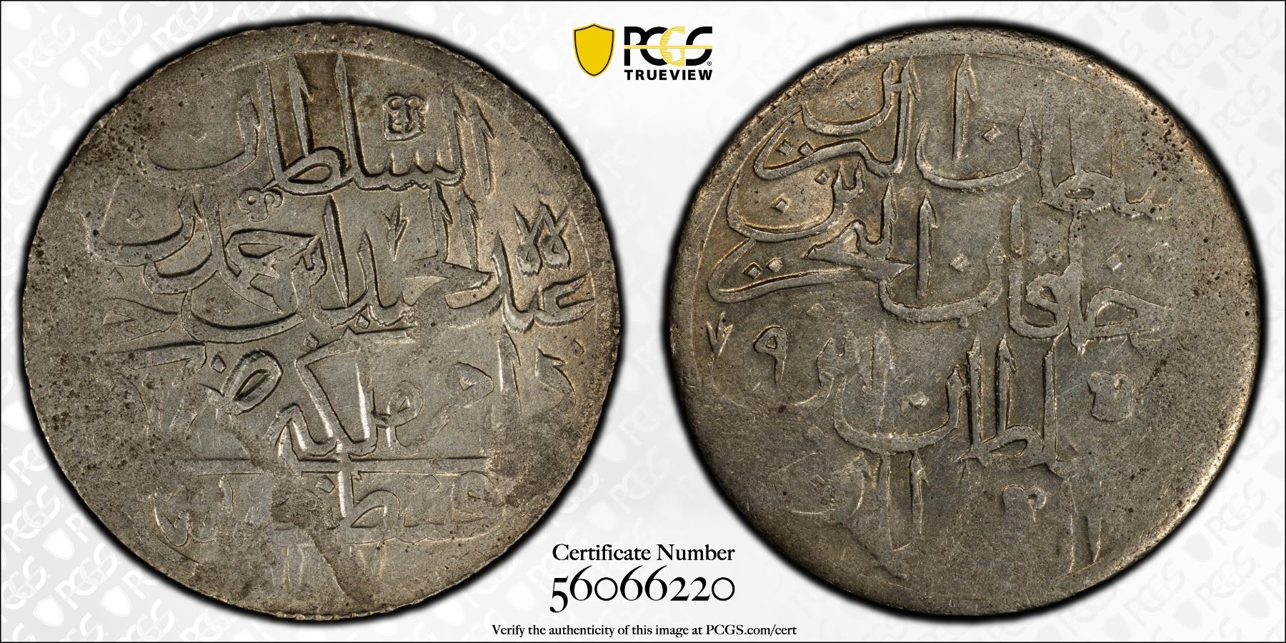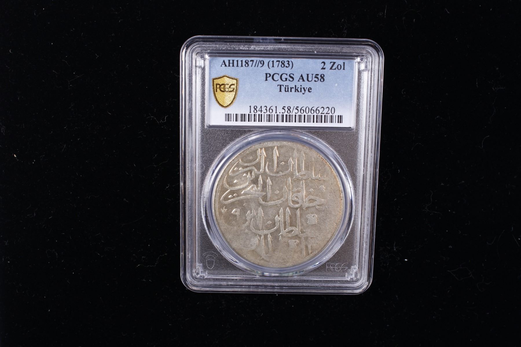 TURKEY: Abdul Hamid I, 1774-1789, AR 2 zolota (60 para), Kostantiniye, AH1187 year 9, KM-402, an attractive nearly mint state example, PCGS graded AU58.