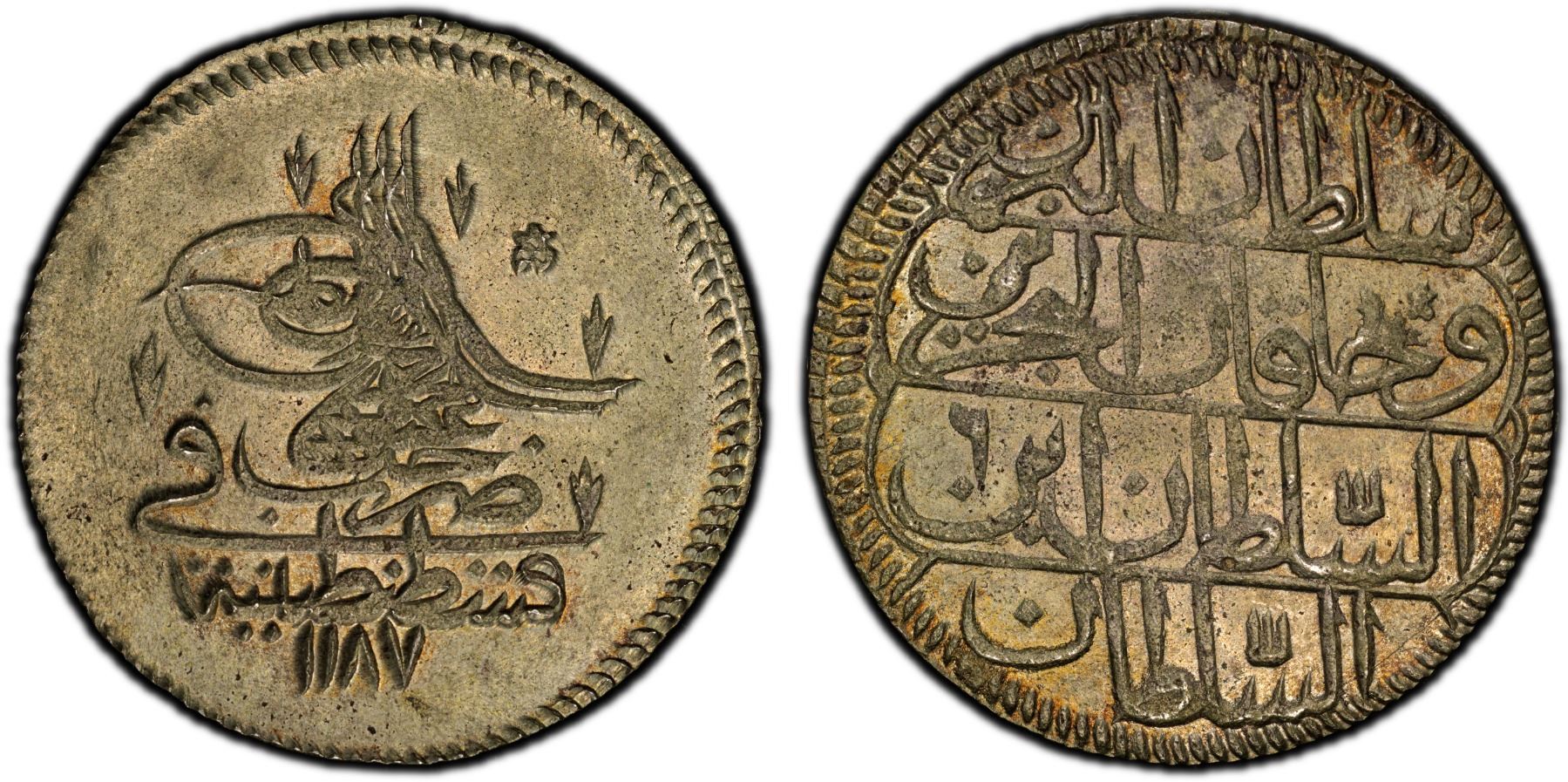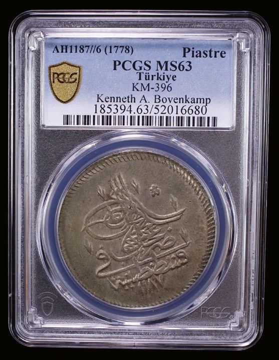 TURKEY: Abdul Hamid I, 1774-1789, AR kurush, Kostantiniye, AH1187 year 6, KM-396, a lovely mint state example! PCGS graded MS63, ex Kenneth A. Bovenkamp Collection.