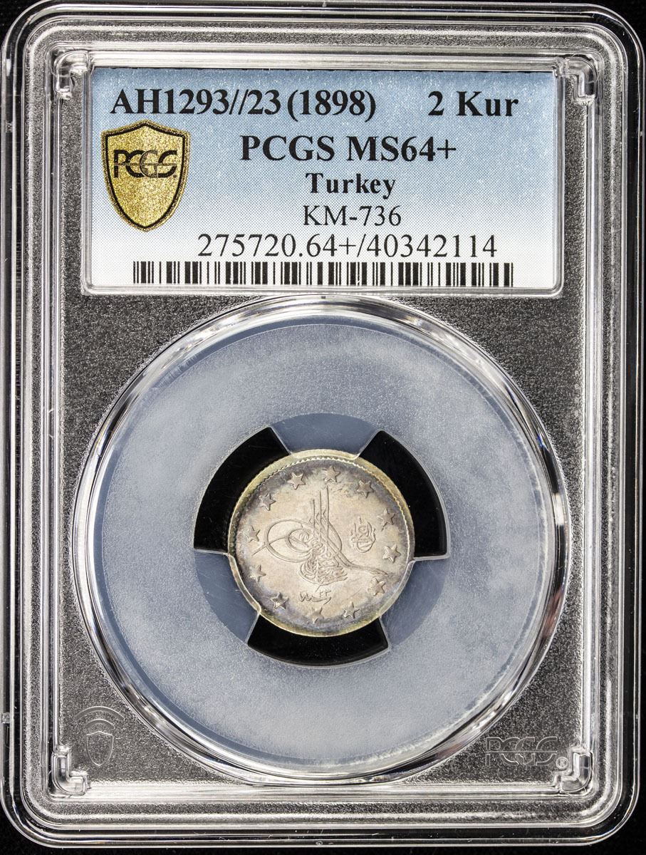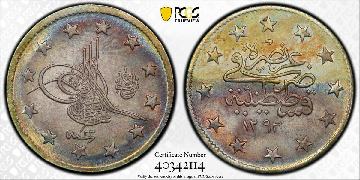 TURKEY: Abdul Hamid II, 1876-1909, AR 2 kurush, Kostantiniye, AH1293 year 23. PCGS MS64