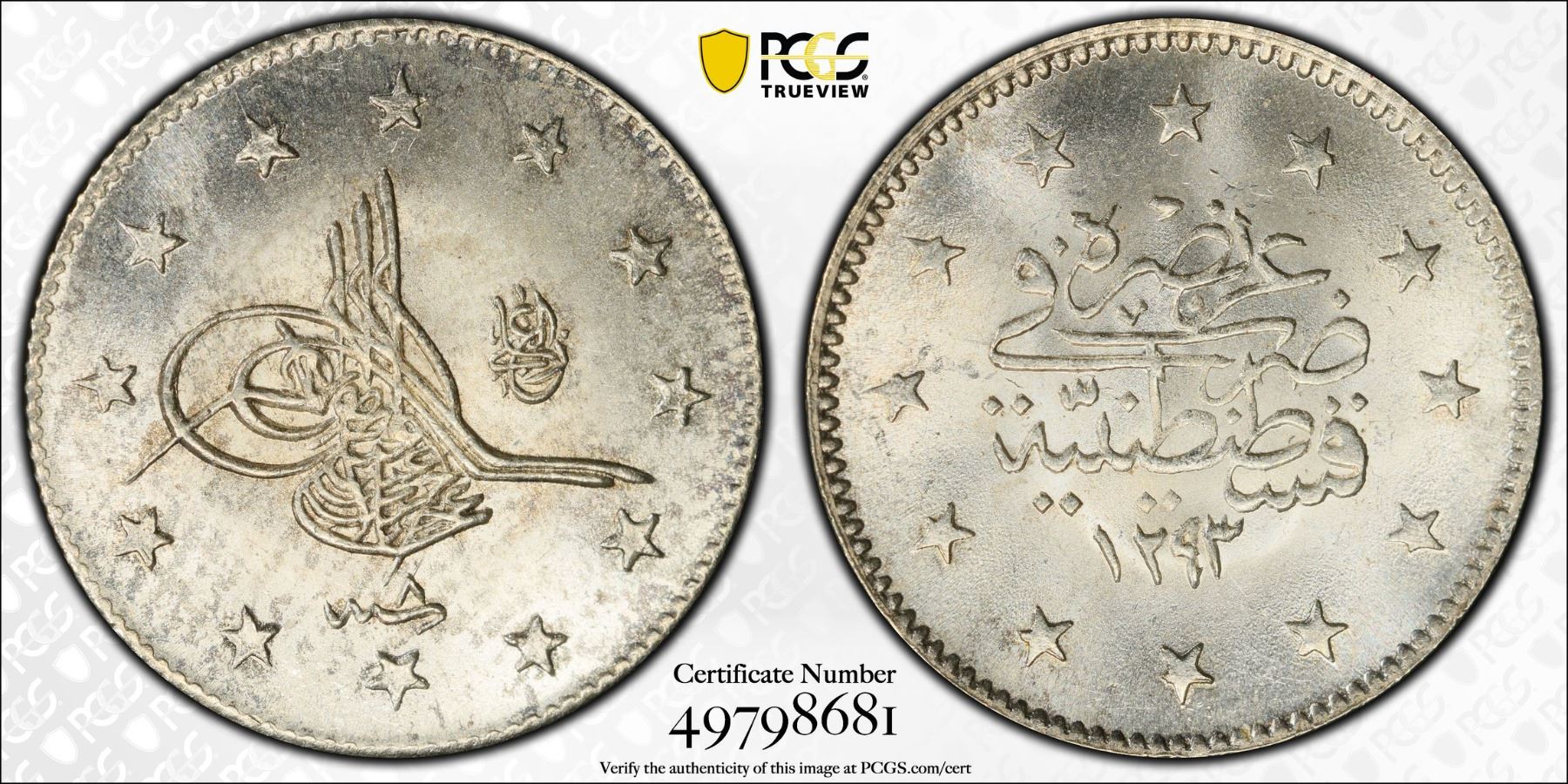 TURKEY: Abdul Hamid II, 1876-1909, AR 2 kurush, Kostantiniye, AH1293 year 8 (1883), PCGS MS66