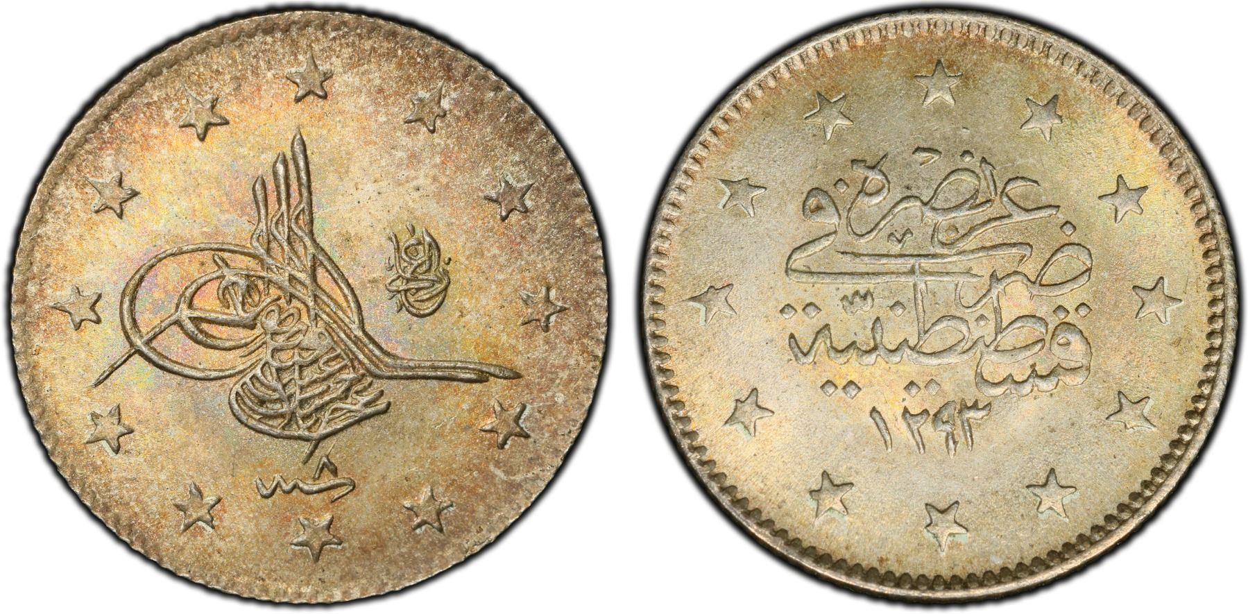 TURKEY: Abdul Hamid II, 1876-1909, AR 2 kurush, Kostantiniye, AH1293 year 8 (1883), PCGS MS66