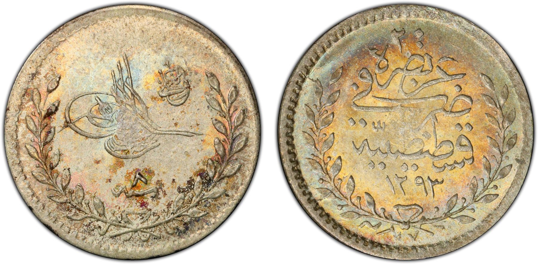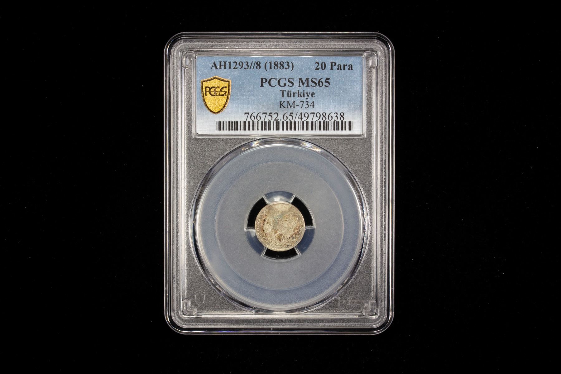 TURKEY: Abdul Hamid II, 1876-1909, AR 20 para, Kostantiniye, AH1293 year 8 (1883), KM-734, a superb lustrous attractively toned mint state example! PCGS graded MS65. Part of a small group of 42 coins of this accessional date and regnal year purchased by Maj. Fred S. Pridmore in Cyprus in the 1960s.
