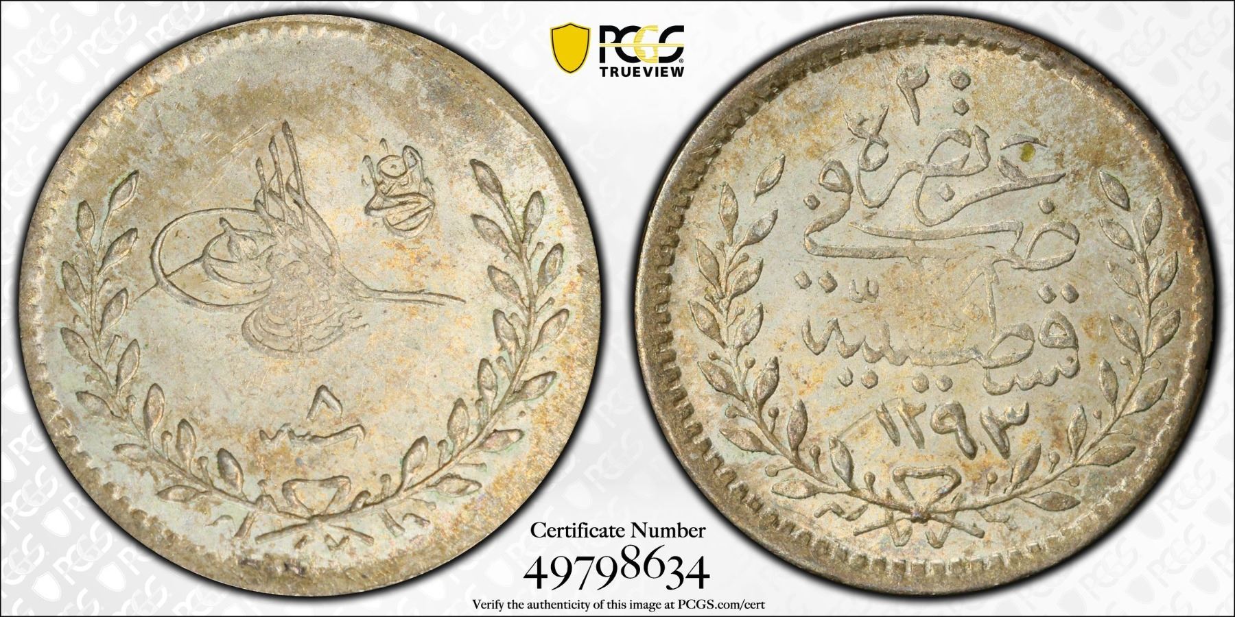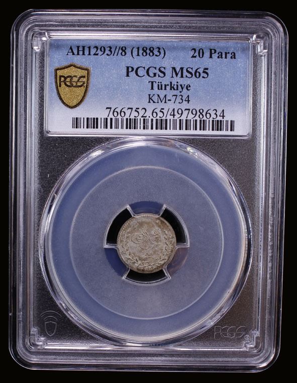 TURKEY: Abdul Hamid II, 1876-1909, AR 20 para, Kostantiniye, AH1293 year 8 (1883), KM-734, a superb lustrous mint state example! PCGS graded MS65. Part of a small group of 42 coins of this accessional date and regnal year purchased by Maj. Fred S. Pridmore in Cyprus in the 1960s.