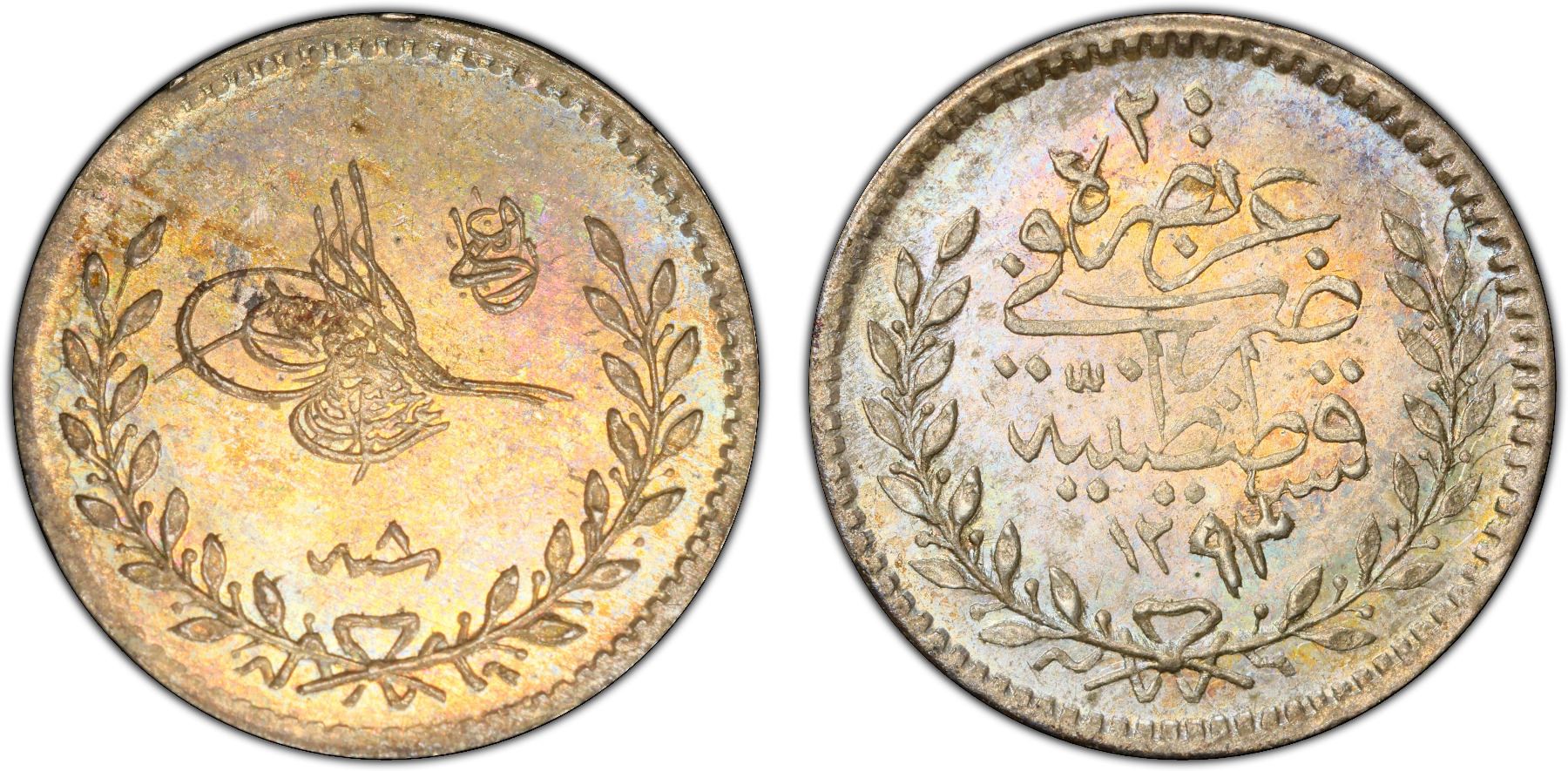 TURKEY: Abdul Hamid II, 1876-1909, AR 20 para, Kostantiniye, AH1293 year 8 (1883), KM-734, a fantastic lustrous toned mint state example! PCGS graded MS66. Part of a small group of 42 coins of this accessional date and regnal year purchased by Maj. Fred S. Pridmore in Cyprus in the 1960s.